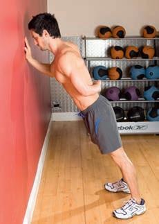 You need to keep your elbow tucked in to maintain balance, which places the emphasis on your triceps. To make the move harder, stand further away from the wall.