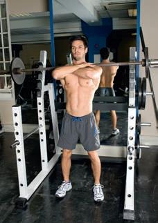 Placing the bar on the front of your shoulders makes your back more upright in the squat, emphasising your quads and lessening the pressure on your lower back.