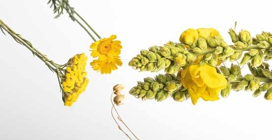 Les plantes officinales biologiques qui composent le Velian Complex : molène, graines de lin, camomille des teinturiers, immortelle