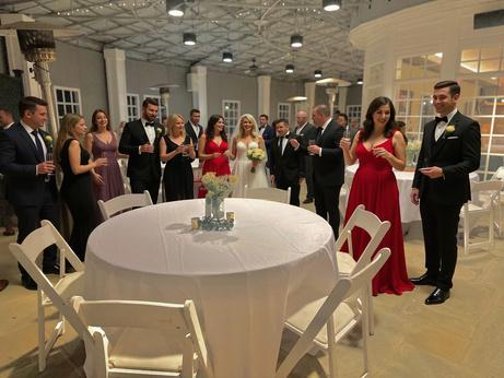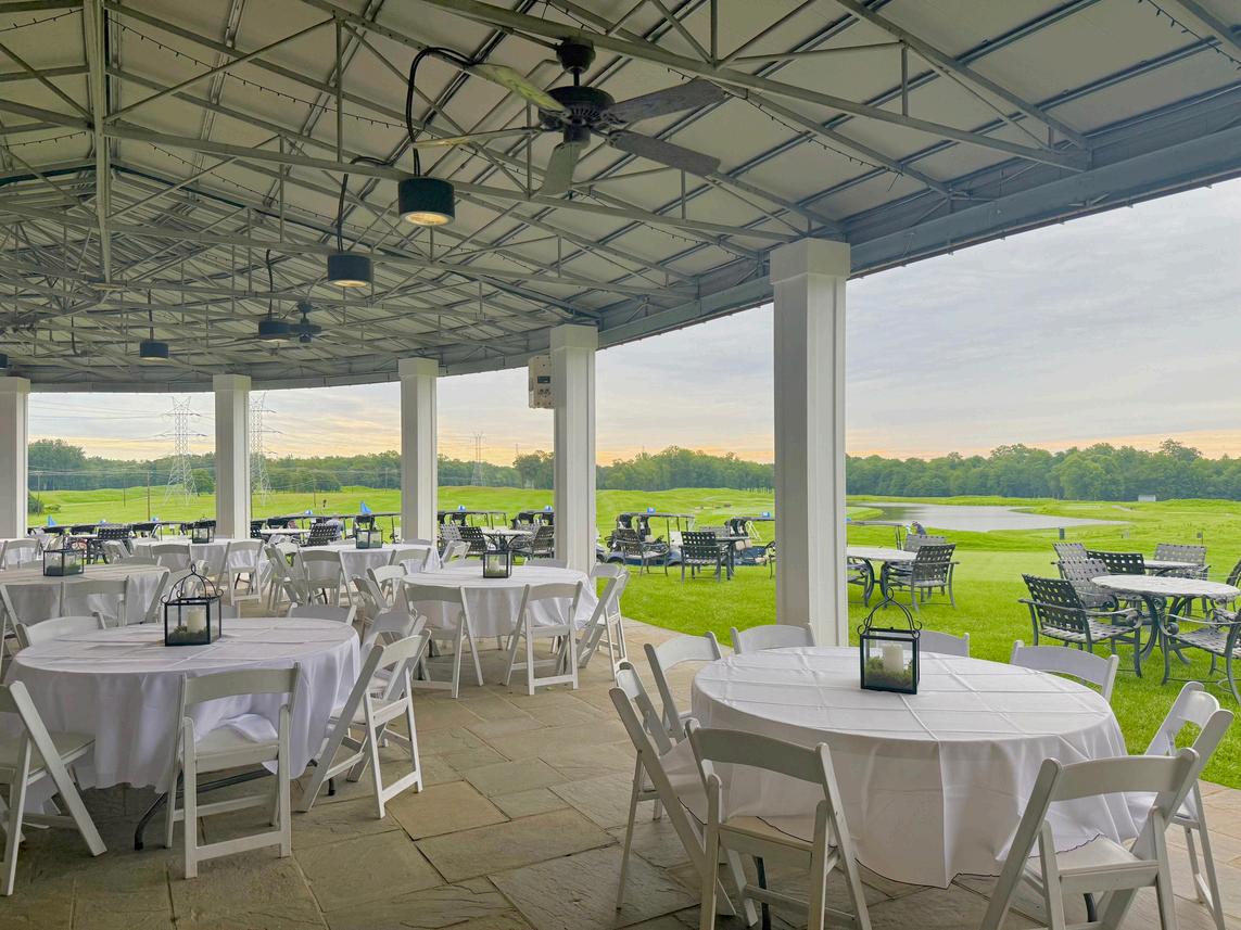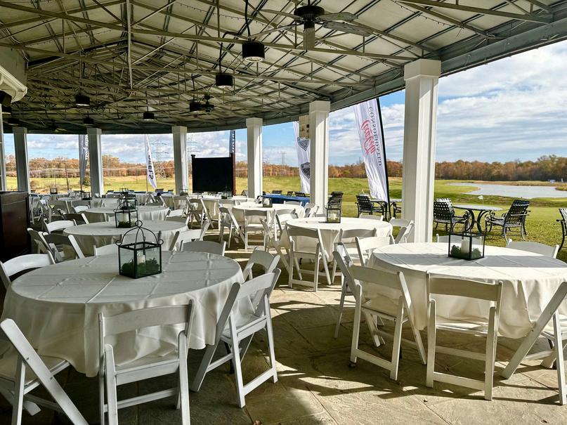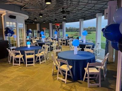 For a banquet, we have 18 round tables that seat 8 guests each, for a total veranda seating capacity of 144. We have ten rectangular tables: six that are 6-foot in length; two that are 8-foot long, and 2 that are 4-feet in length. These are used for player check-in, silent auction and raffle prize display, sponsor presentation, and at the tee box as needed.