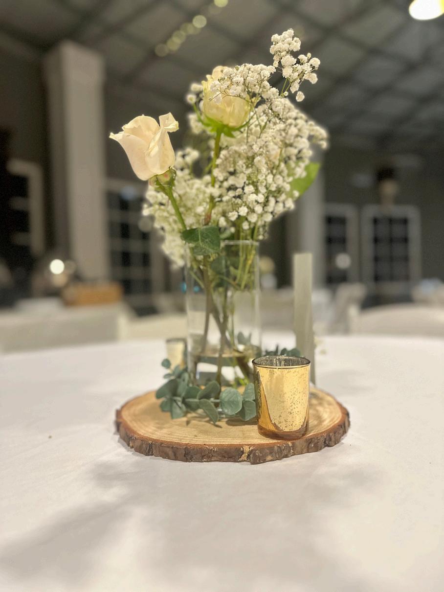 A variety of linen colors, centerpieces, tables, chairs, and catering equipment is available.