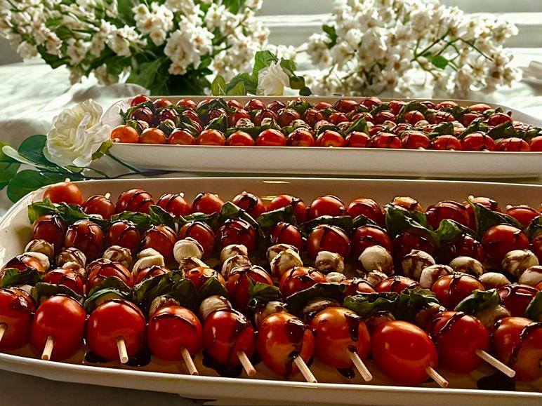 Caprese Skewers - Ripe cherry tomatoes, mozzarella balls and fresh basil drizzled with a balsamic glaze.
