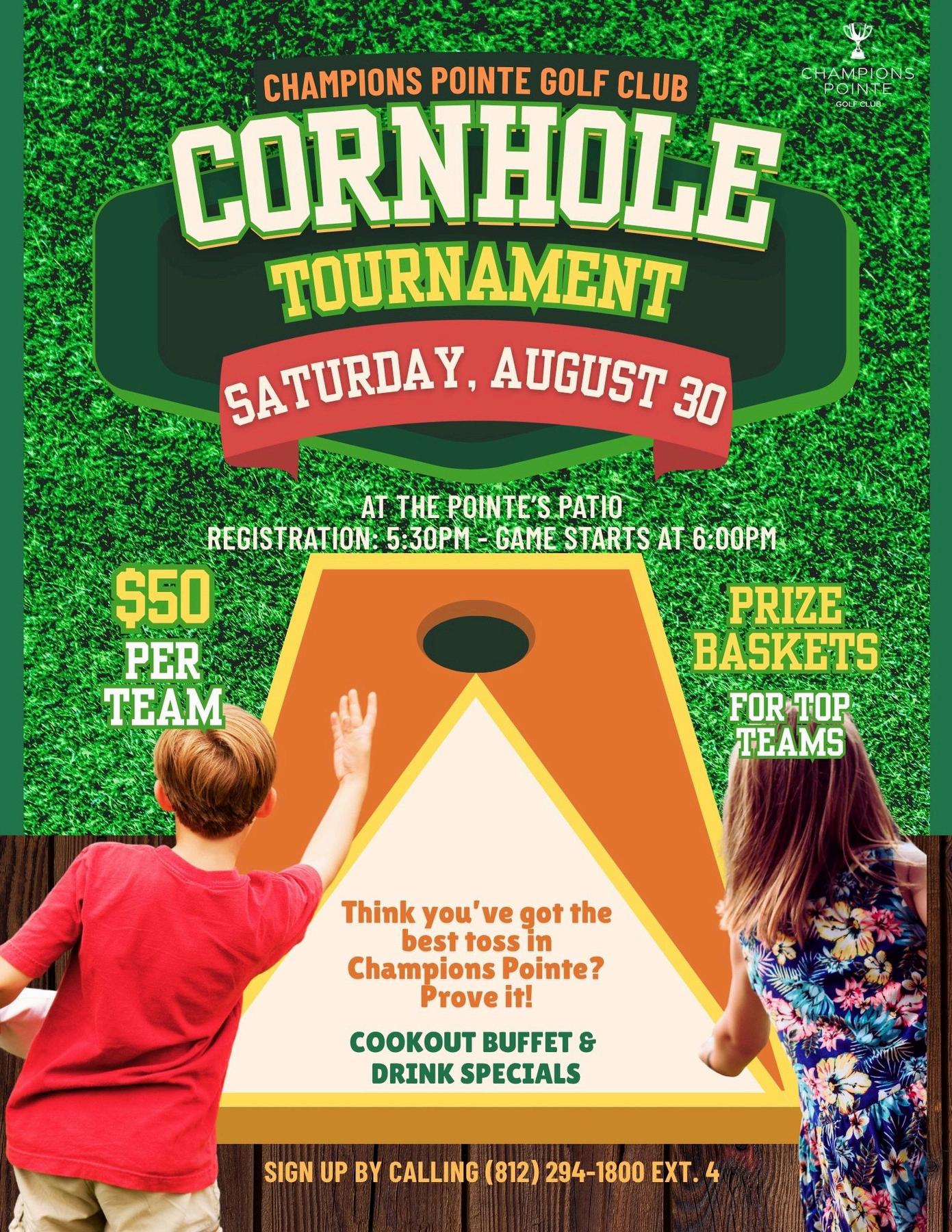 Get ready for a fun-filled evening at Champions Pointe Golf Club! Join us on Saturday, August 30th for our Cornhole Tournament on The Pointe’s Patio. Registration begins at 5:30PM and the games kick off at 6:00PM. Teams of two can enter for $50, with prize baskets up for grabs for the top teams. Enjoy a cookout buffet and drink specials throughout the evening. Think you’ve got the best toss in Champions Pointe? Prove it!