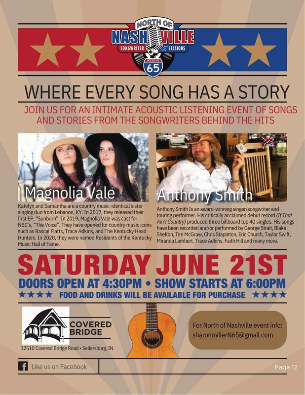 Join us at Covered Bridge Golf Club on Saturday, June 21st for North of Nashville: Songwriter Sessions an acoustic evening with Magnolia Vale and hit songwriter Anthony Smith Enjoy live music and the stories behind the songs in an intimate setting. Doors open at 4:30 PM, show starts at 6:00 PM. Food and drinks available for purchase