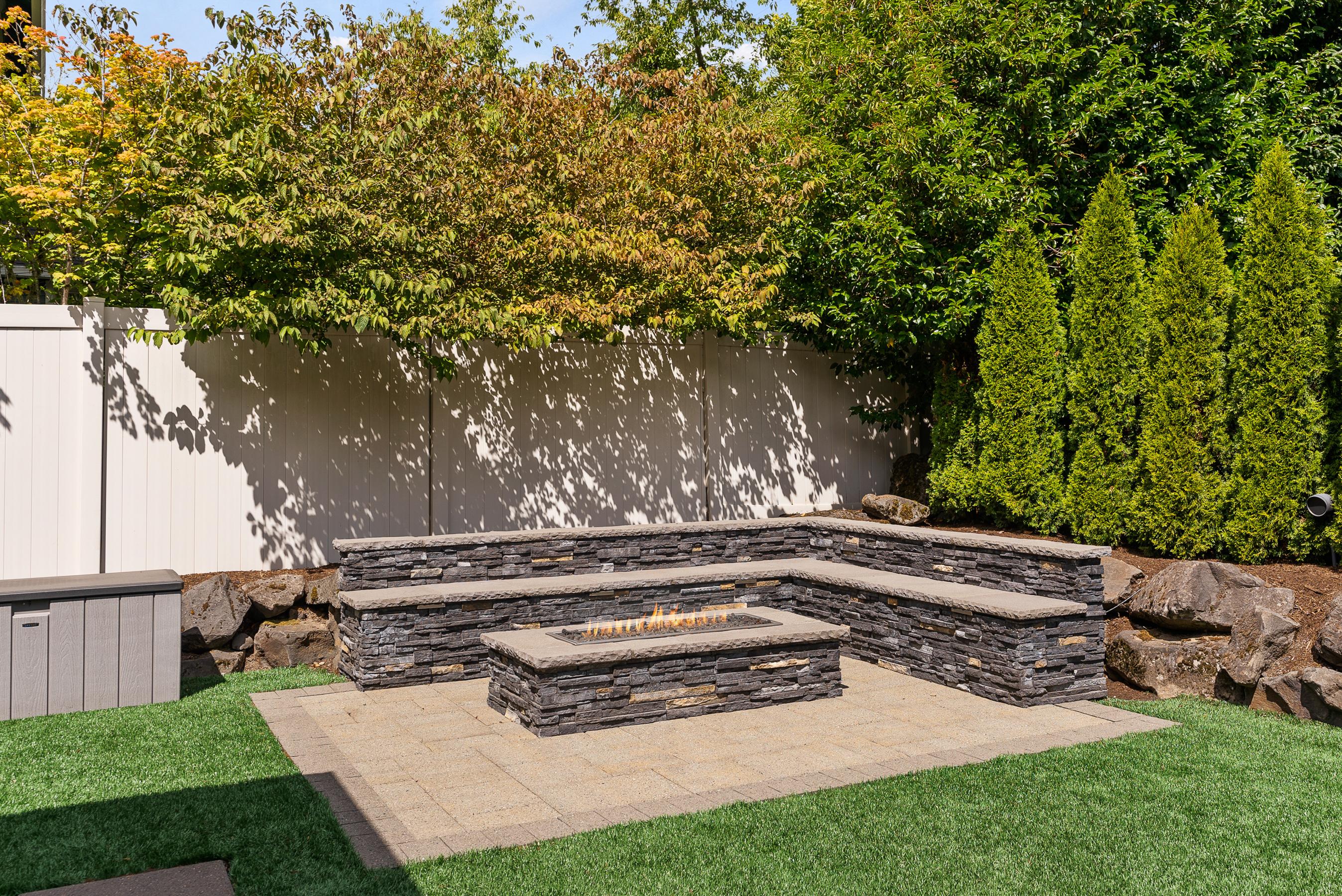 Outdoor living experience with custom pool, hot tub, covered grill & gas fire pit w/ bench seating