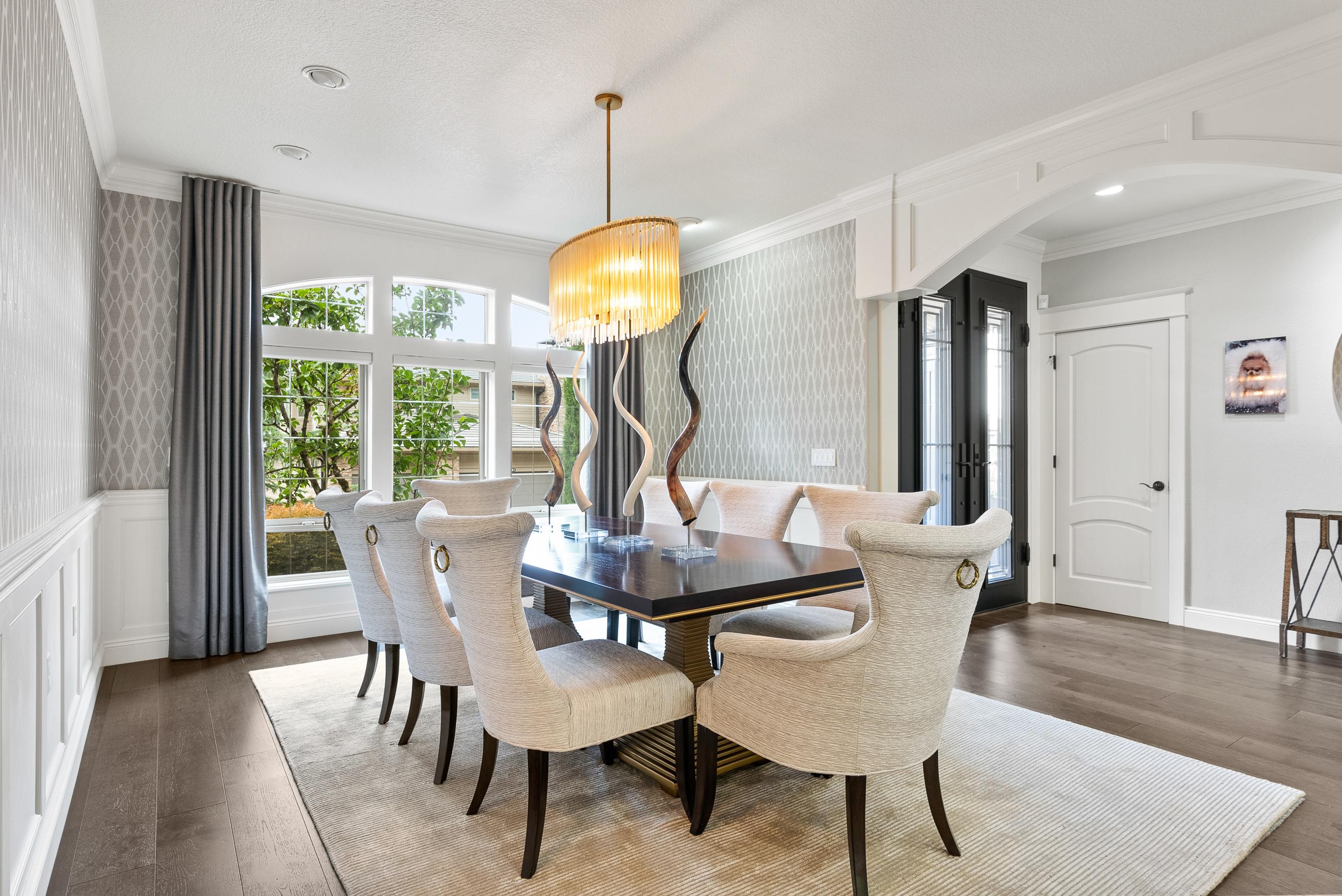 Formal dining room with exquisite custom lighting, elegant wall paper & rich wainscoting