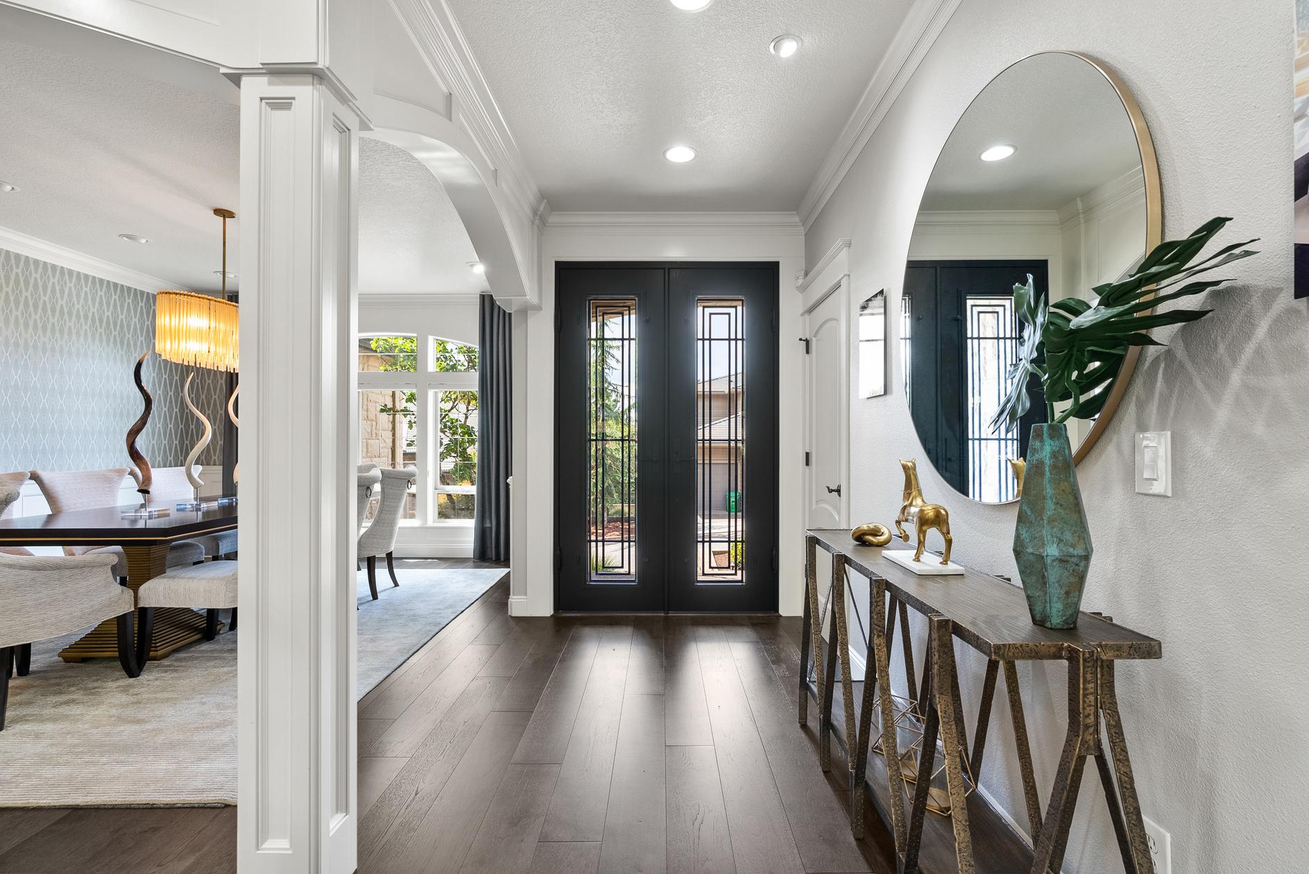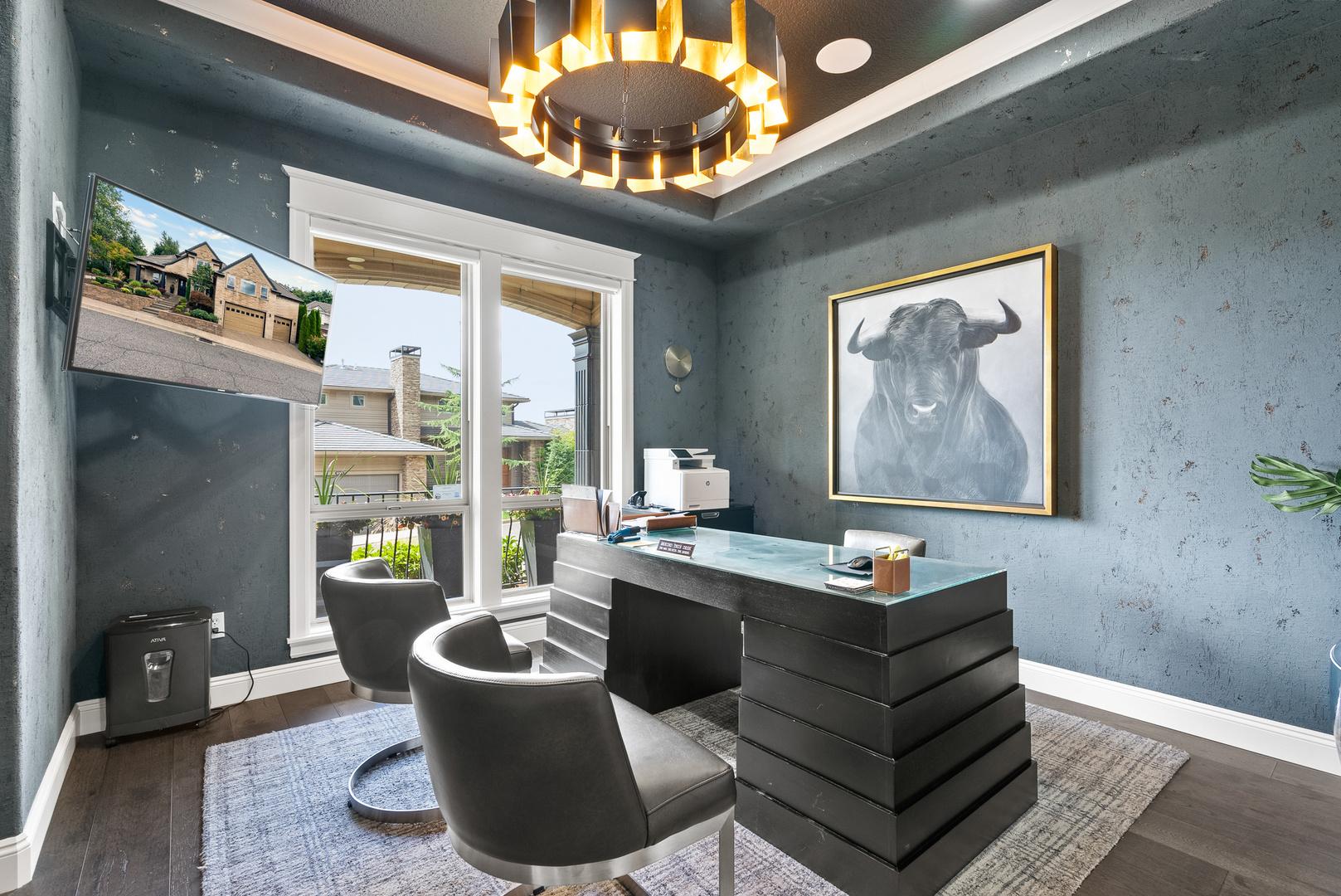 Strong main floor office w/ custom built-ins, french doors & custom Bravura wall finish