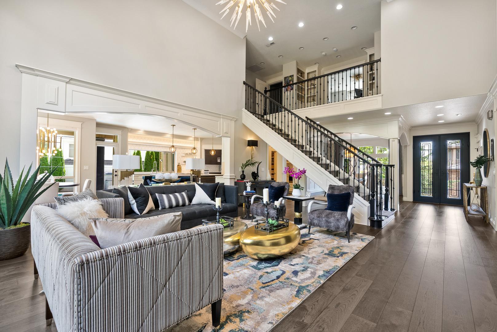 Great room opens to the kitchen w/ floor-to-ceiling wall of windows & fireplace