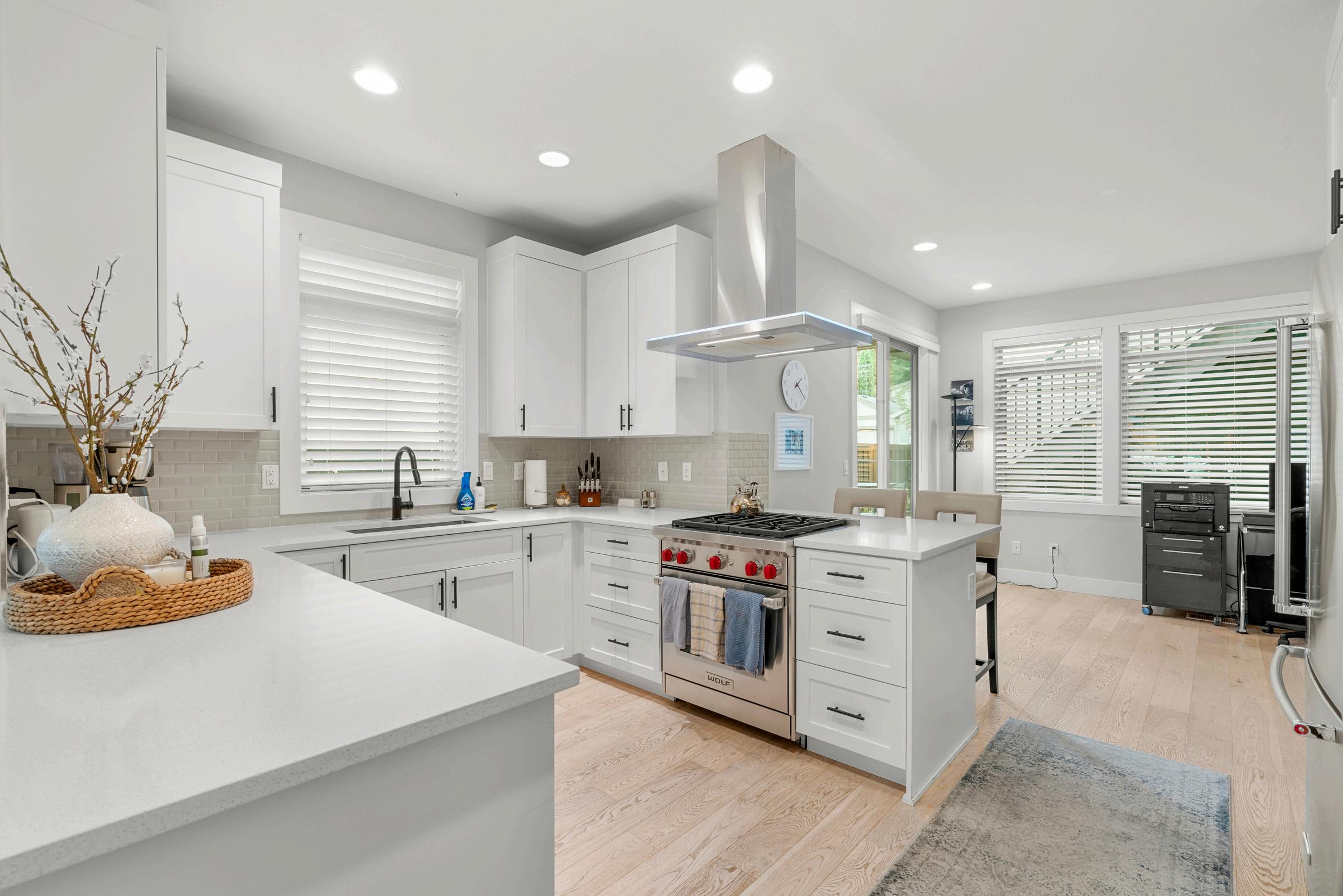 Gourmet kitchen boasts Wolf appliances, quartz countertops, a wall of bright windows, and engineered hardwood floors