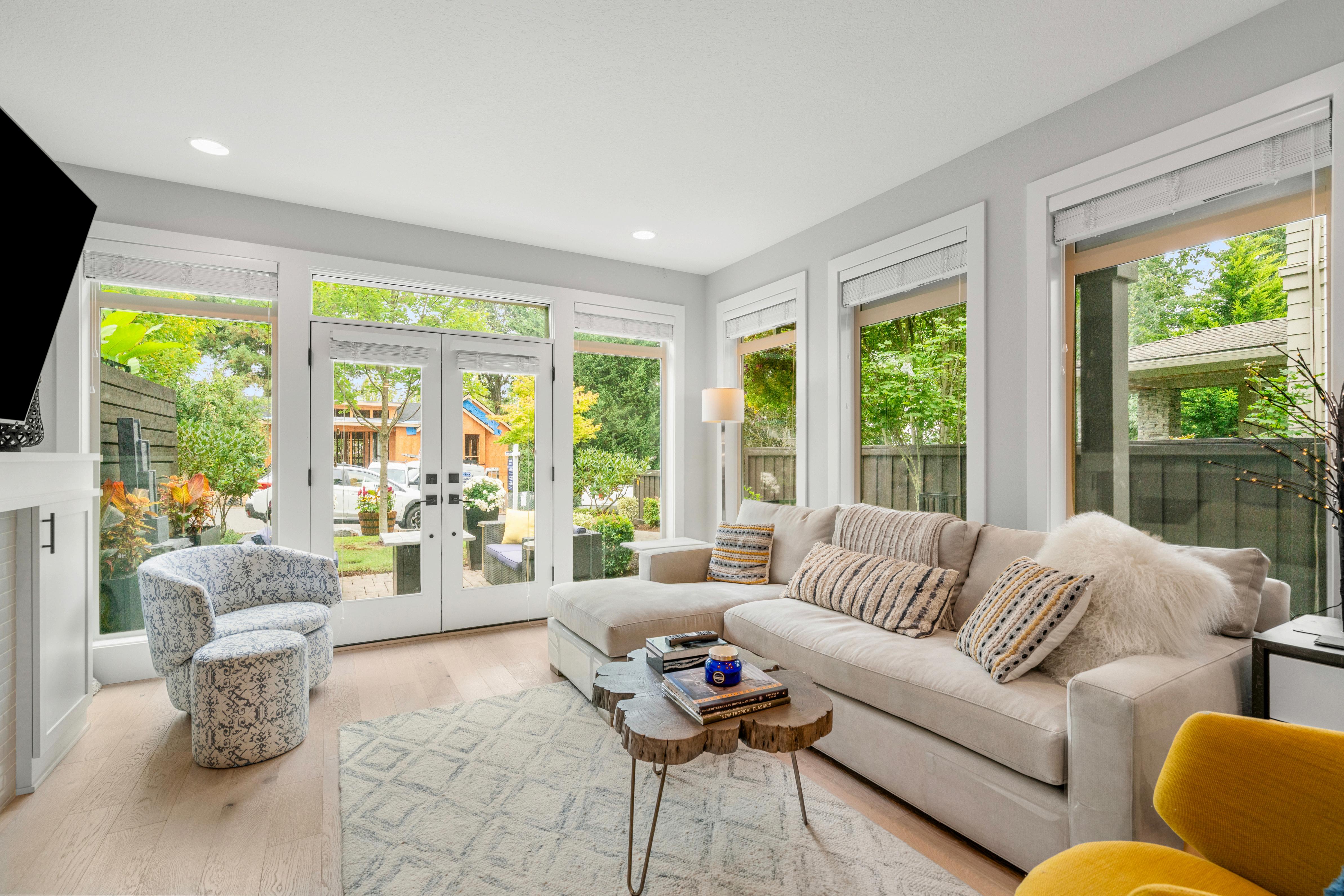 Elegant living room highlighted by a gas fireplace, sun-filled windows, and French doors opening to the front patio an ideal setting for entertaining