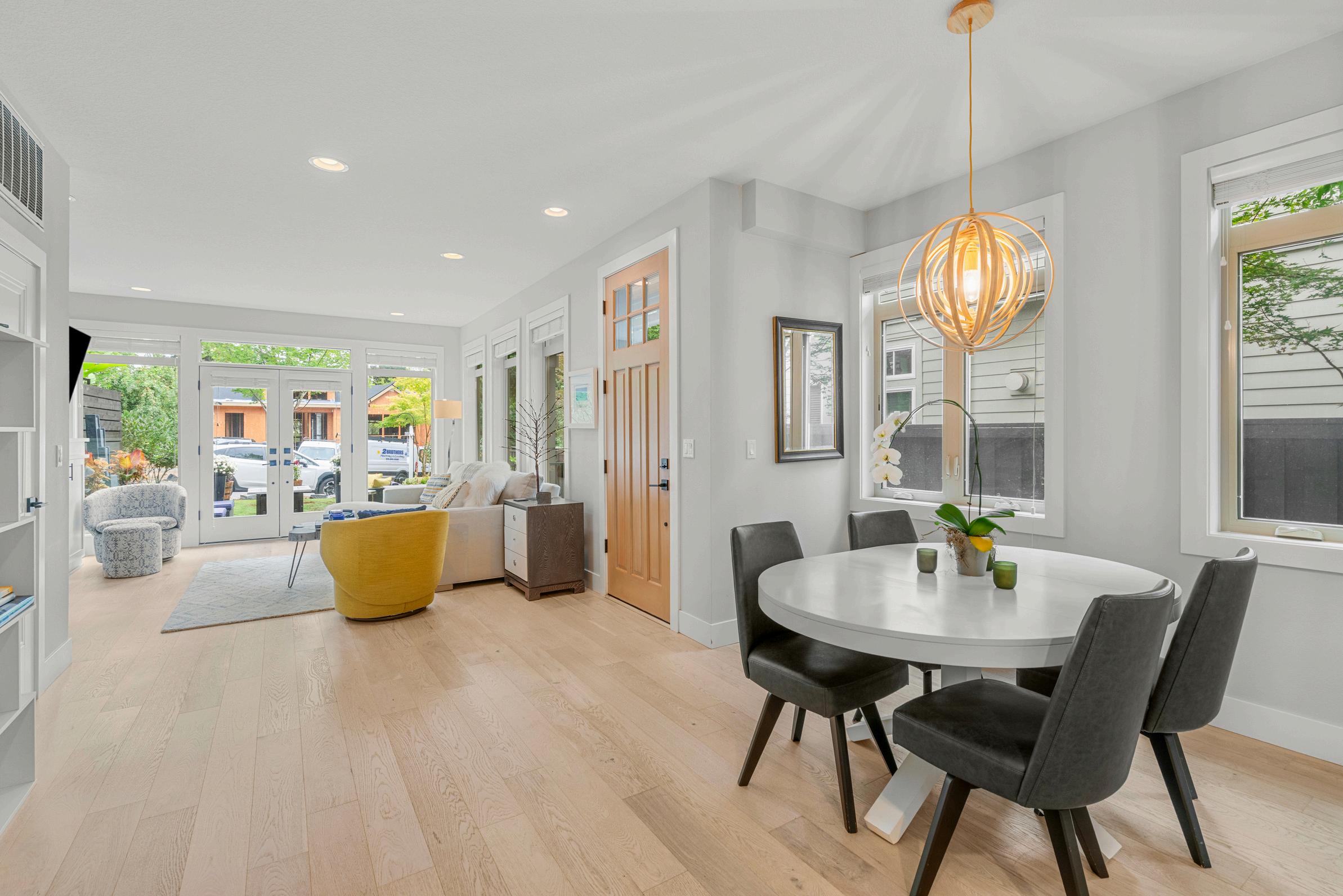 Open-concept flow seamlessly connects the living room, dining nook, and kitchen
