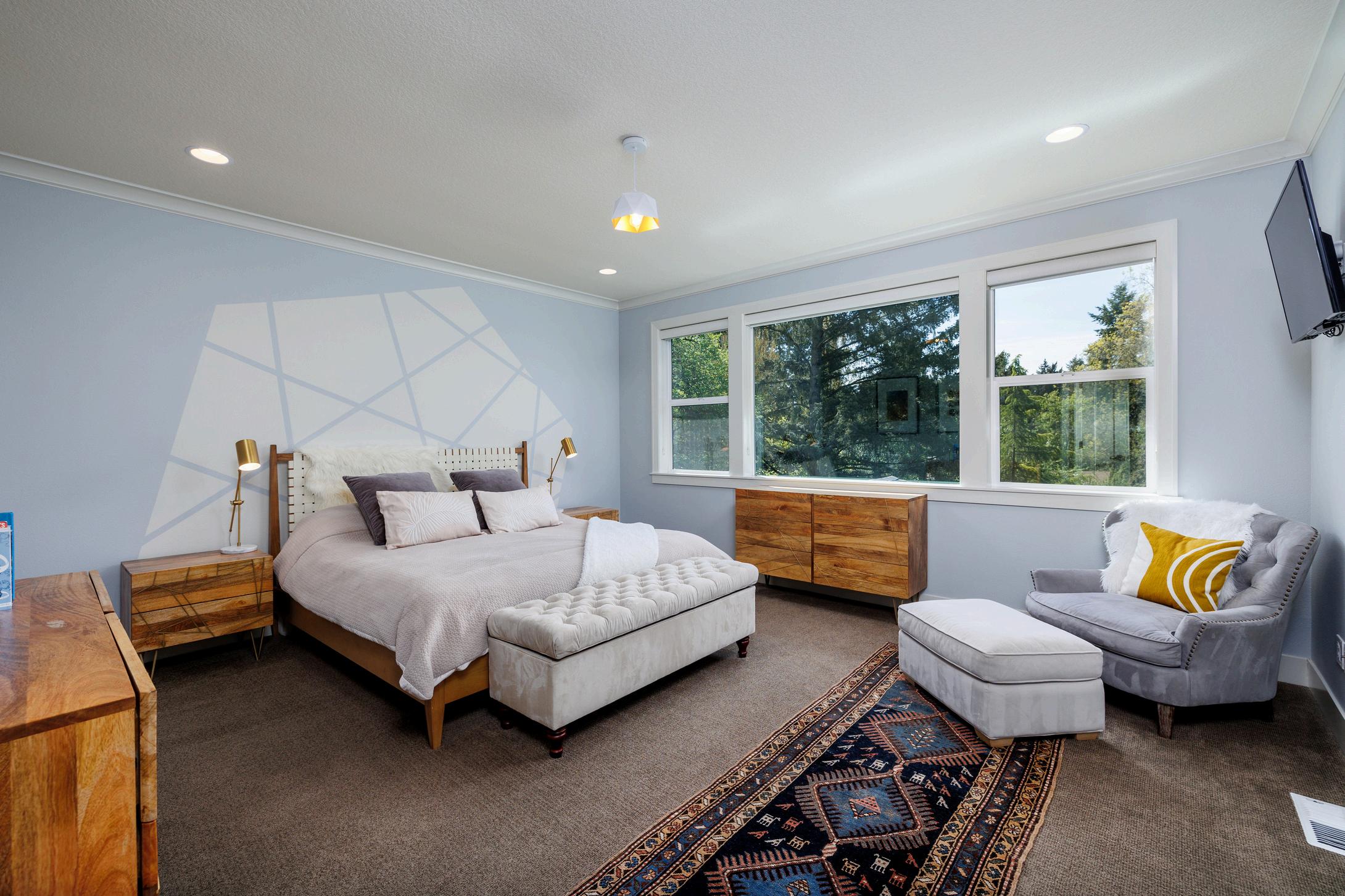 Main floor bedroom with an adjacent full bath can be used for guests or flex space