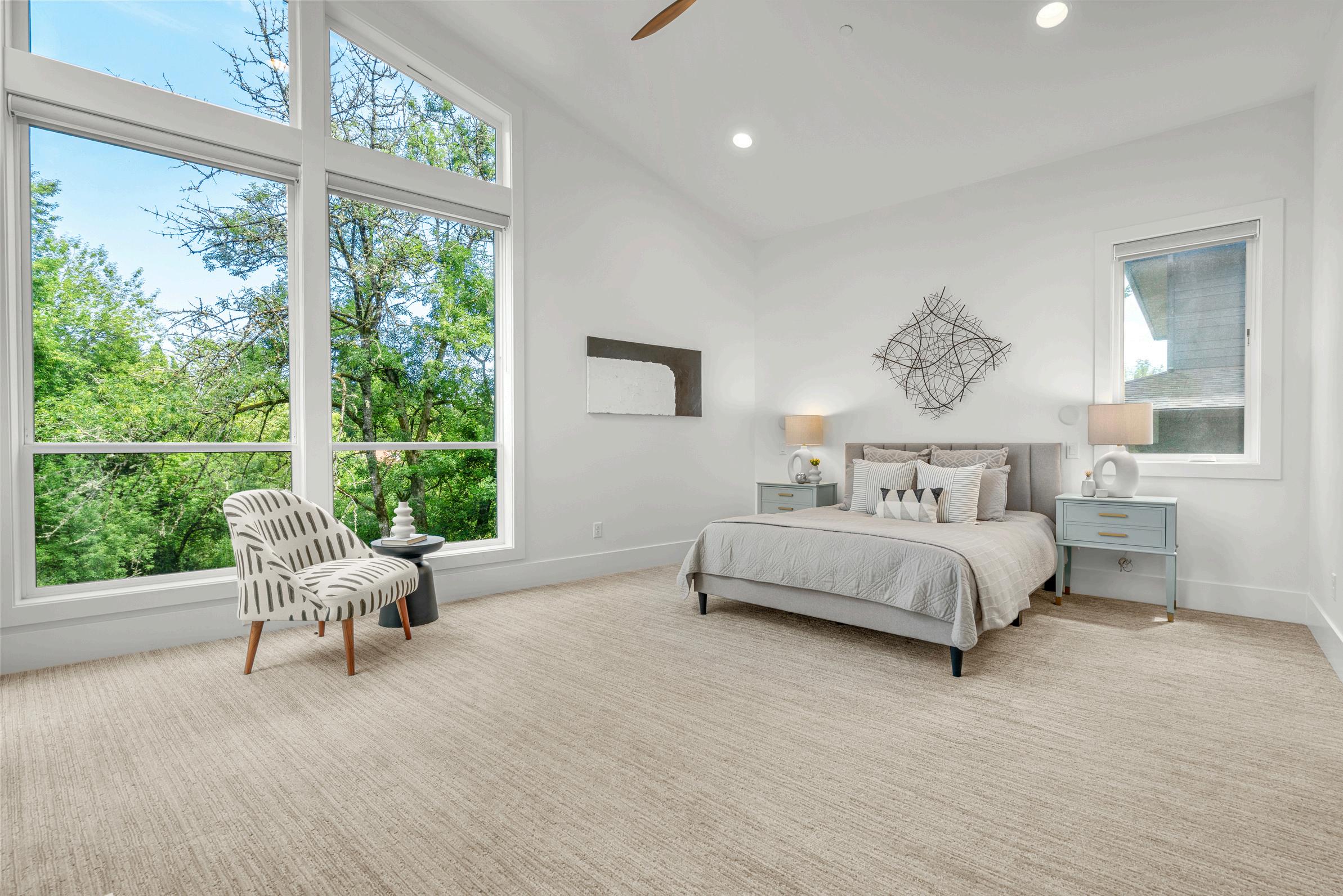 Light & bright main level primary suite with walls of windows, a massive walk-in closet and luxurious ensuite with dual sinks, spacious walk-in shower and a soaking tub