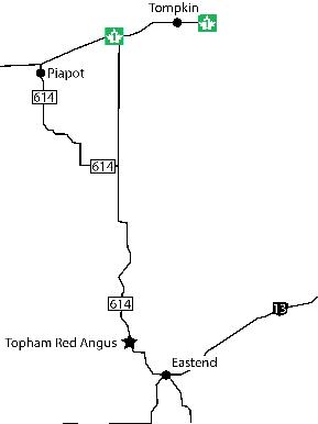 From the #1 Highway, turn south at the Sidewood Grid sign, this turns into the grid road 614, go 59km, turn west/right at the Topham Red Angus bull sign.