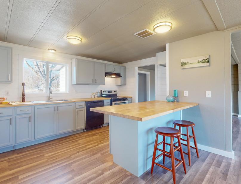 Beautifully updated 3 BR 2 BA home on ONE ACRE with large shop/outbuildings--country feel on edge of city for ultimate convenience! Open layout, easy care laminate floors throughout, dining area with built-in storage, and split-bedroom design! Light and bright NEW kitchen with plenty of storage, ample counter space, stylish shiplap walls, butcher block counter tops, and dining bar. Spacious primary suite with walk-in closet and
