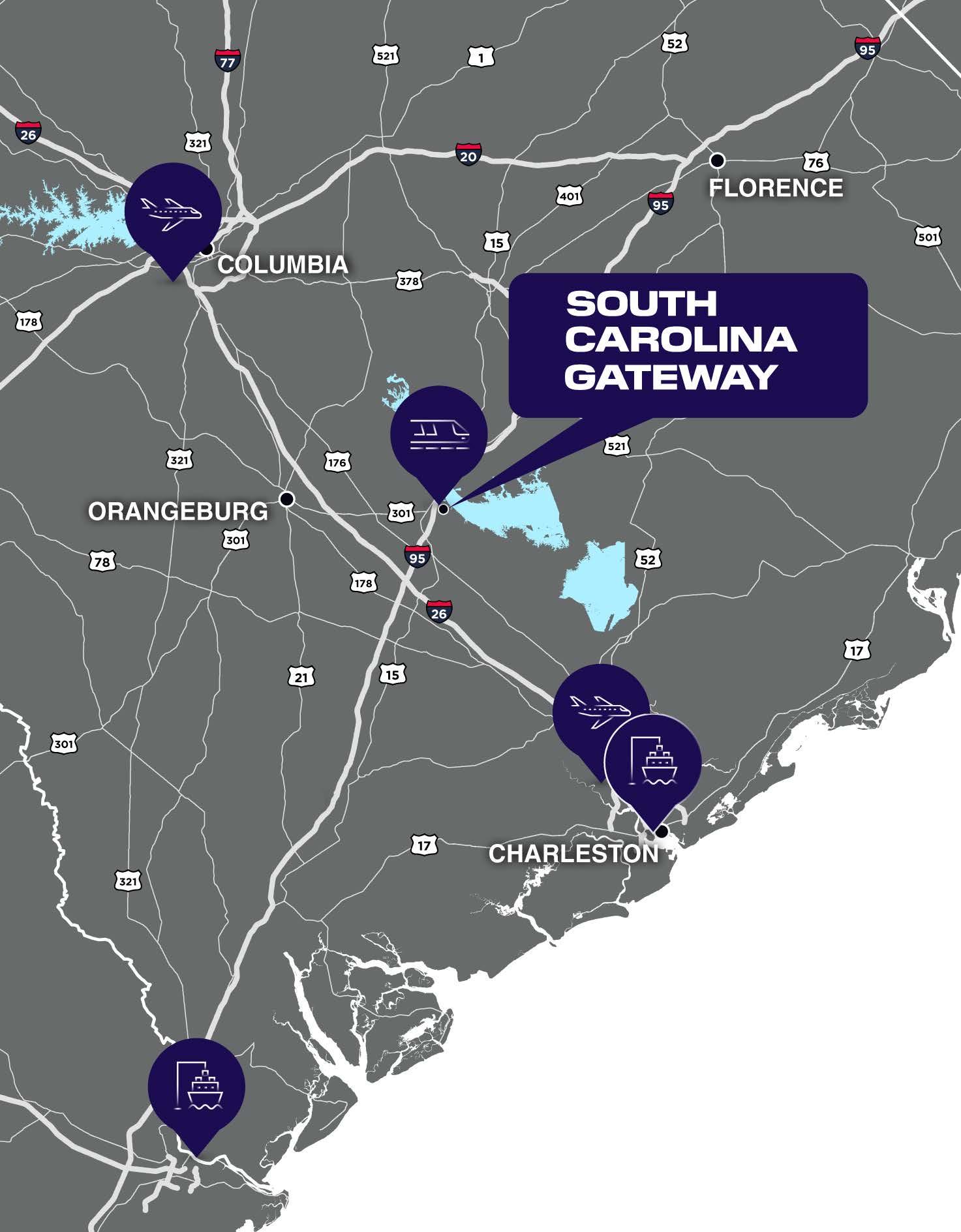 As one of South Carolina’s largest available industrial parks, South Carolina Gateway is paving the way for bold new possibilities. Situated within Orangeburg County’s Global Logistics Triangle at the fourway interchange of Highway 301 & I-95, the park offers 1,000 developable acres with the ability to accommodate a dozen world-class industrial facilities ranging in size from 50,000 SF to 1 million square feet.