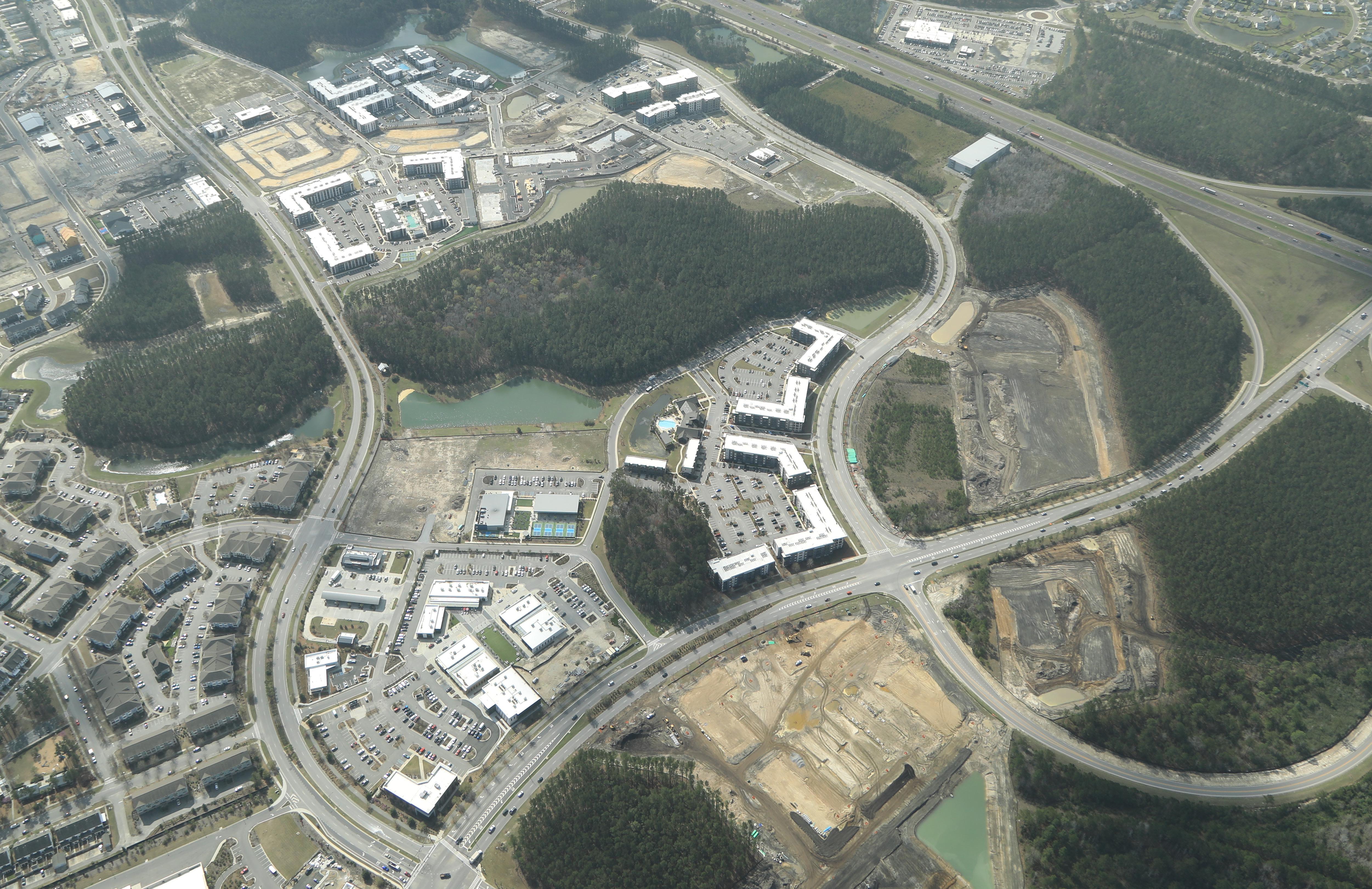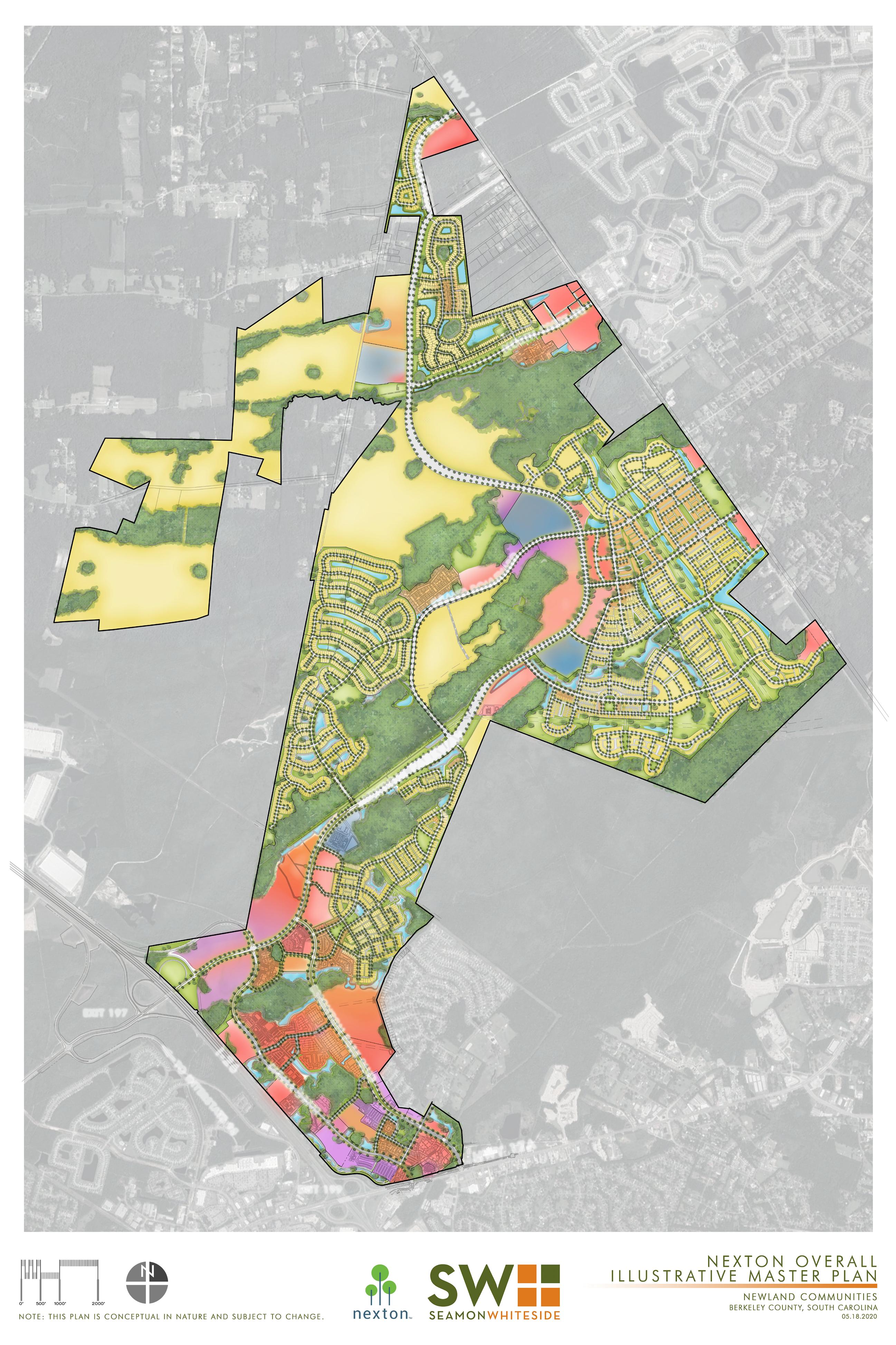 Nexton is designed to live and work like a town. It mixes together apartments, entertainment, homes, hotels, offices, parks, restaurants, shops, and schools. Tying everything together with a network of trails and pathways.