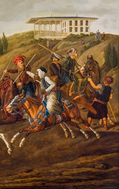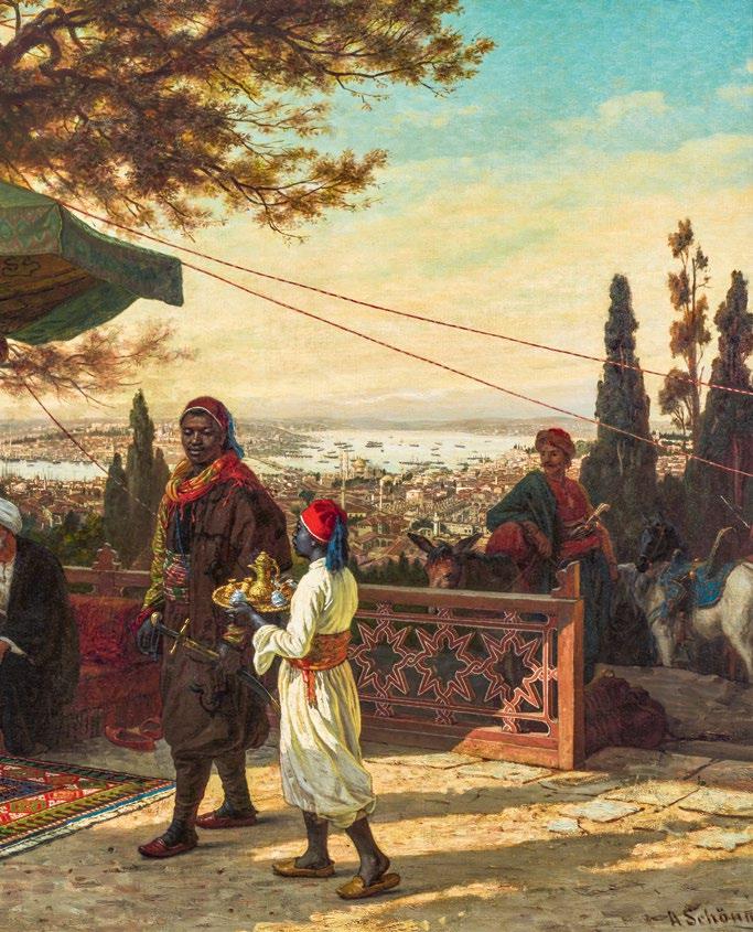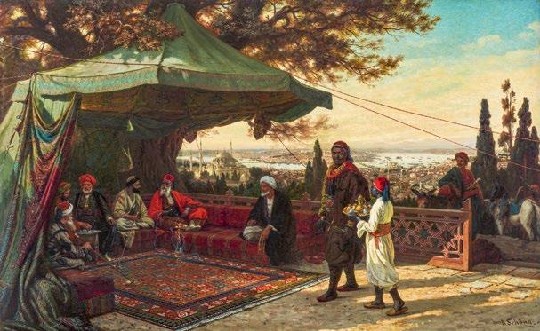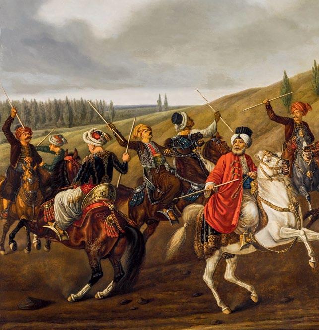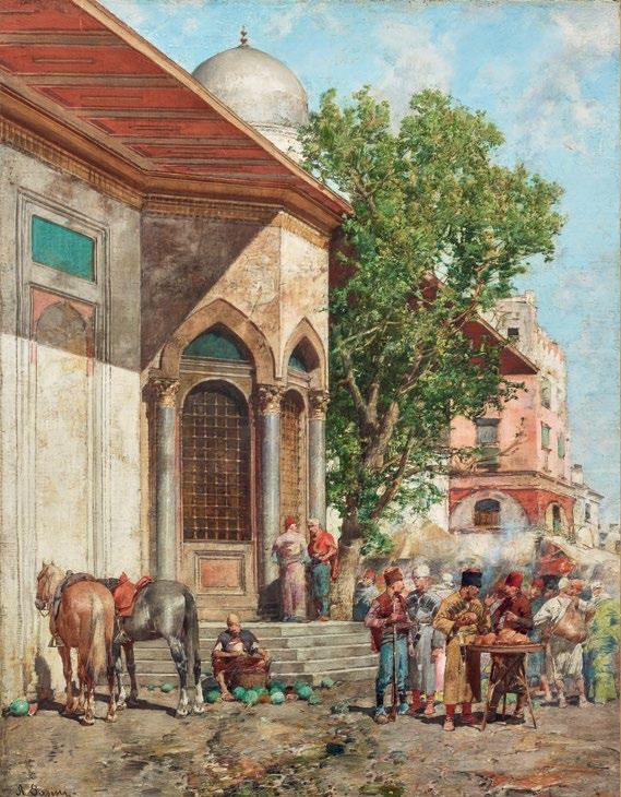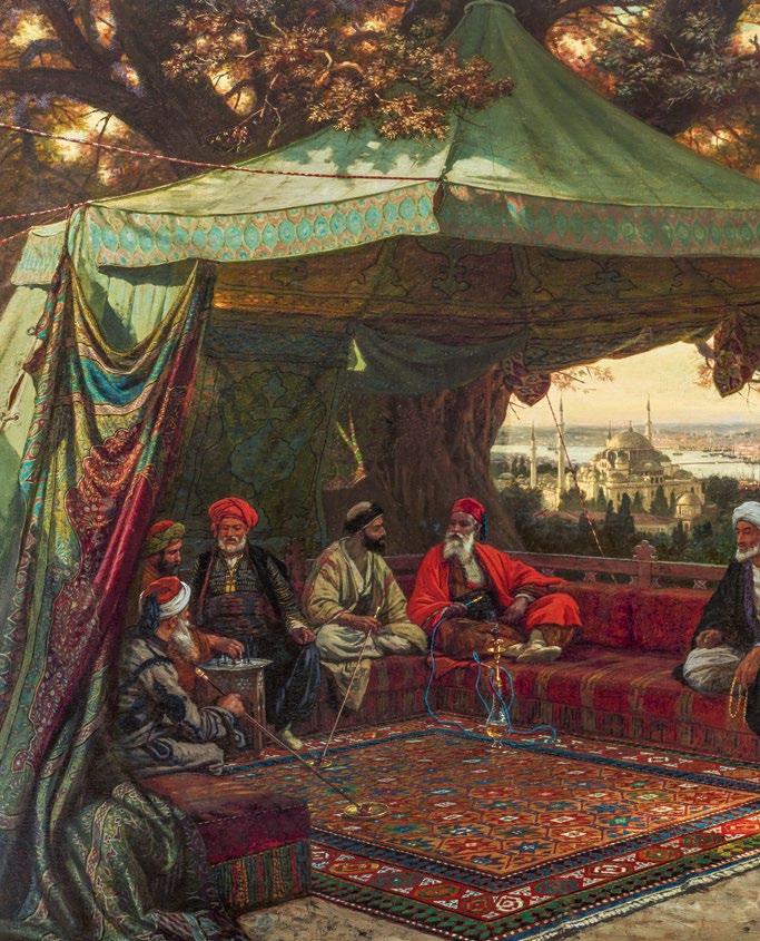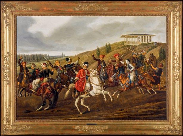 A rare Ottoman tent panel adds another dimension to this panorama of imperial life. It evokes the splendour of the moving court, where portable architecture mirrored the magnificence of permanent palaces. This sense of place is echoed in European visions of the East: atmospheric paintings of Constantinople by Alois Schönn and Alberto Pasini, and Carl Adolph Heinrich Hess’s dynamic depiction of the cirit game, capturing moments of movement, ceremony, and encounter between cultures.