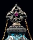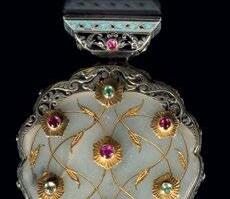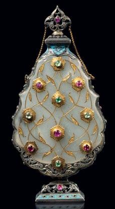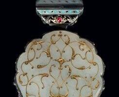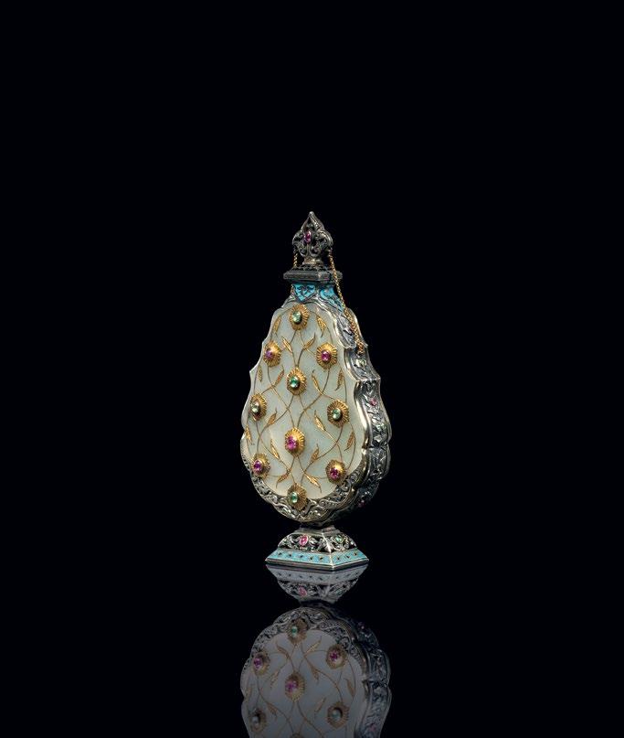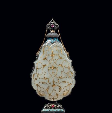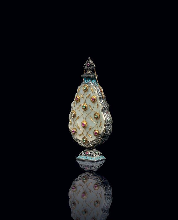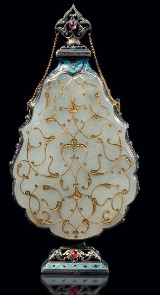 Surrounding this monumental highlight is a carefully curated selection of works that illuminate the richness and diversity of artistic production across the Ottoman and Mughal worlds. A distinguished group of Iznik ceramics demonstrates the height of Ottoman ceramic achievement, their luminous glazes and rhythmic designs reflecting a refined aesthetic cultivated at court. Complementing these is a rare jade perfume flask from the Ottoman imperial workshop, enamelled and set with rubies and green sapphires in gold mounts—an object of intimate scale yet exceptional luxury, encapsulating the courtly synthesis of precious materials and refined craftsmanship.