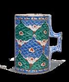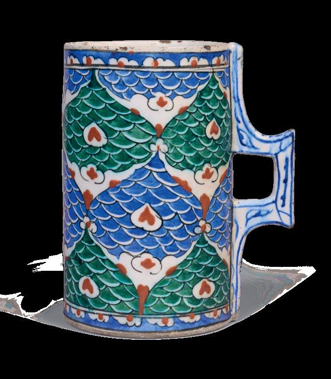 Two other comparable Iznik tankards decorated with blue and green fish-scale design are in the Ömer M. Koç collection and the Musee National de la Renaissance – Chateau d’Écouen. Please see, Hülya Bilgi, Ateşin Oyunu–SadberkHanımMüzesiveÖmerM.Koç KoleksiyonlarındanİznikÇiniveSeramikleri, Vehbi Koç