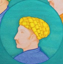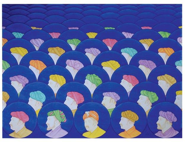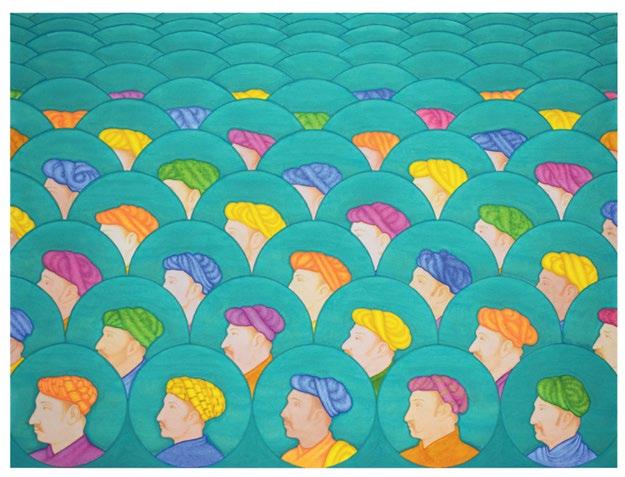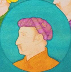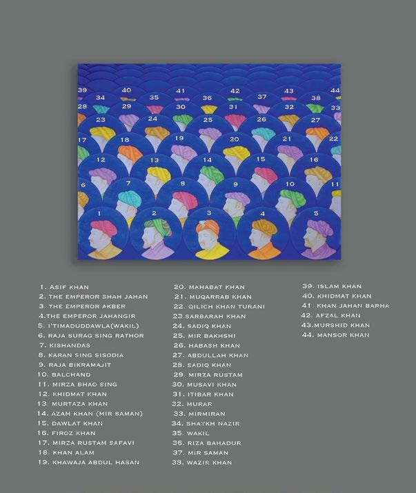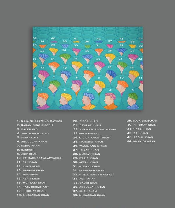 In Silent Whispers in Turquoise, there are no emperors present, instead Khayyam gives the position of honour to the Mughal artist Balchand, whose portrait is in the centre foreground, flanked by prominent Hindu noblemen on the front row, and key Muslim grandees of the imperial court on the second row. In so doing, Khayyam draws particular inspiration from the painting in the Padshahnama of Jahangir welcoming Shah Jahan on his return from the Mewar Campaign in 1615, by Balchand, where the artist includes his own self portrait at the lower left (Royal Collection Trust, Windsor, RCIN1005025.f).