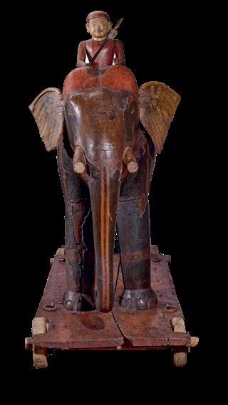 Carved and painted wooden automaton in the form of a near life size elephant being ridden by a prince. The elephant stands on a trolley with four wheels. The elephant goad (ankush) held by the prince is a later addition. Inside the elephant’s body are chords and a wheel arranged so that shifting the tail to the right and left mechanically moves the elephant’s ears back and forth and the right arm of the prince up and down.