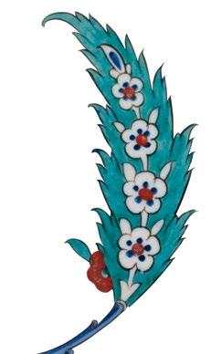 The first example of blossoming prunus reserved in white against a red background occurs in the Selimiye mosque in Edirne (1572). For further information about the prunus blossom motif in Iznik ceramics please see, Nurhan Atasoy & Julian Raby. Iznik: The Pottery of Ottoman Turkey, Thames & Hudson, London, 1989, pp. 249-254. In Iznik ceramics, especially on dishes, the prunus blossom motif usually appears on prunus blossom trees. The present dish is a rare example in which the prunus blossoms are used as an individual, juxtaposed motif.