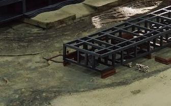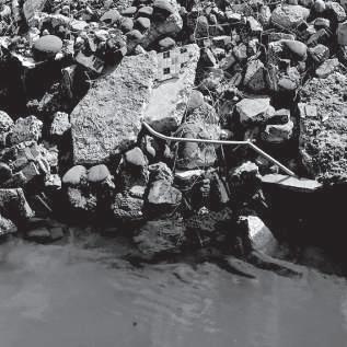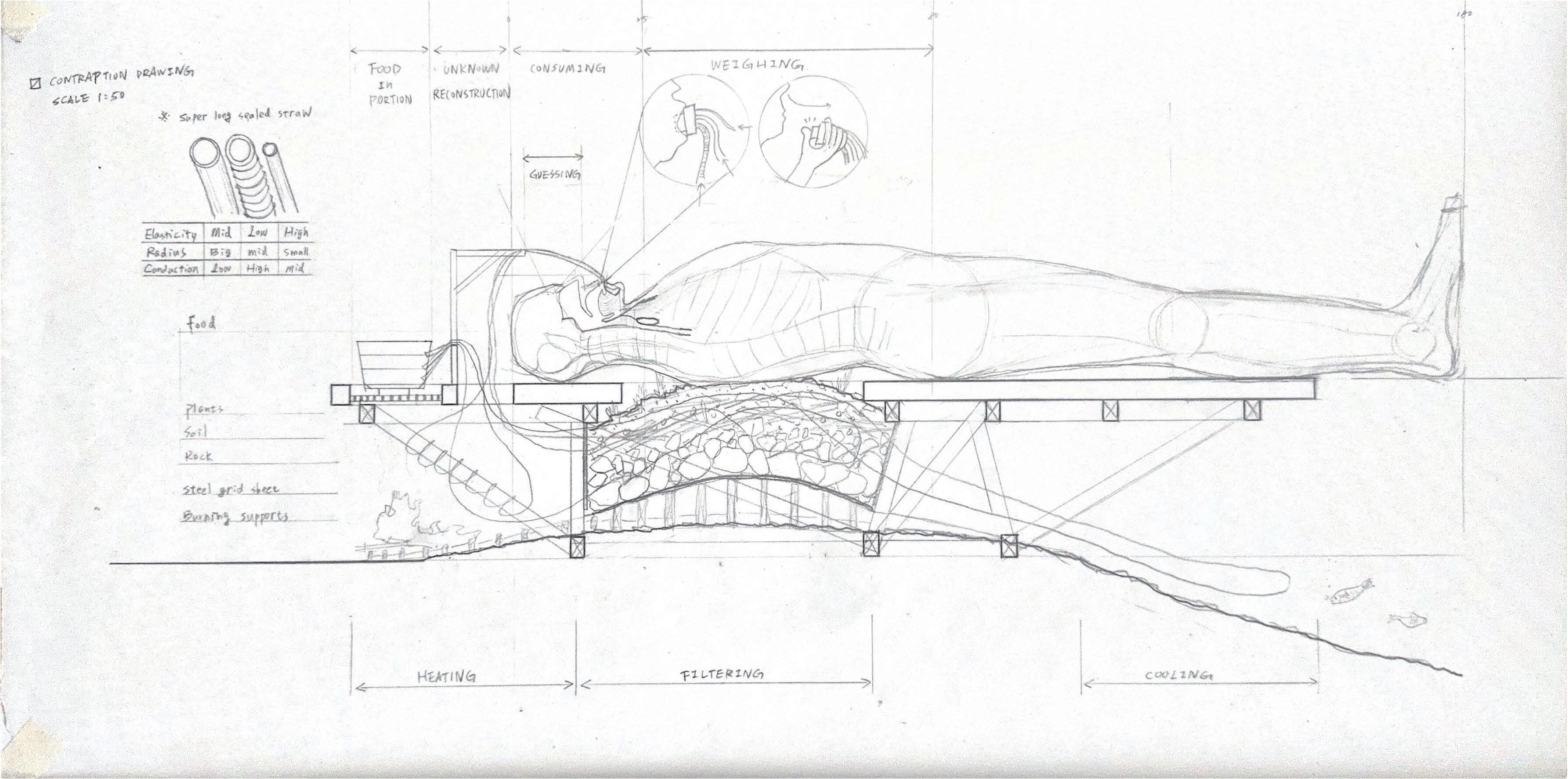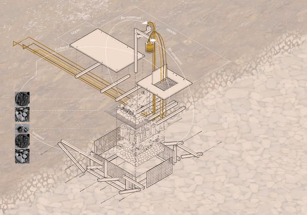 透過1:1裝置「河床」的嘗試,探索身體與環境 的互動,以及如何透過儀式性行為(如進食)被 動地介入環境,也同時作為一個閱讀周邊環境的 介質,特別是河面與河岸介面,揭示了城市的水 作為一種訊息載體。這將個人經驗與更廣闊的環 境感知連結起來,並關注水作為載體的潛力。