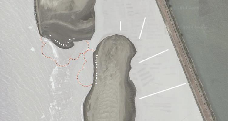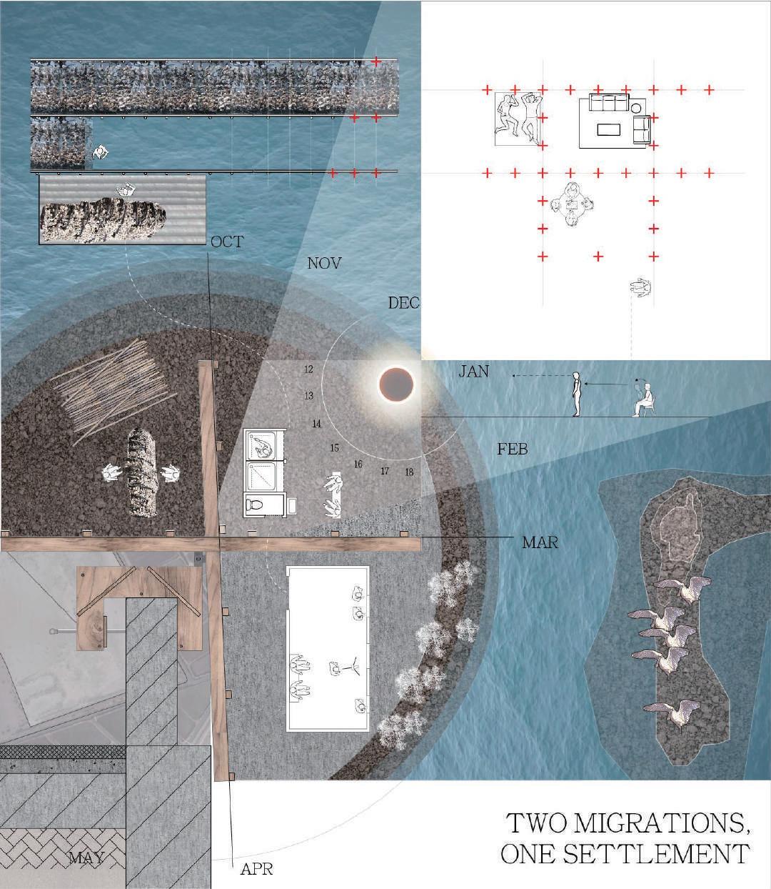 By using the eel fishermen’s fish huts as a starting point, the design addresses their temporary residential needs while simultaneously providing space for birdwatchers, transient workers, and oyster farmers to interact, occupy, and coordinate.