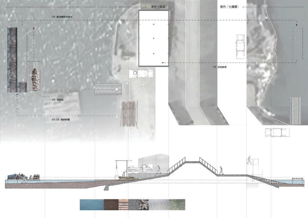 The design intervention overlays three layers: the flow of the oyster industry within the Qigu Lagoon, the migratory patterns of eels and Black-faced Spoonbills, and their respective temporal dynamics. This results in the emergence of new nodes created by the intersection of biological time, industrial time, and human time.