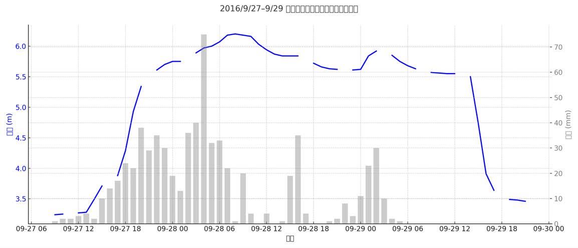 「聖森橋水位+金山雨量」雙軸趨勢圖