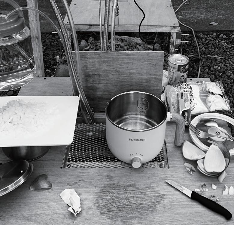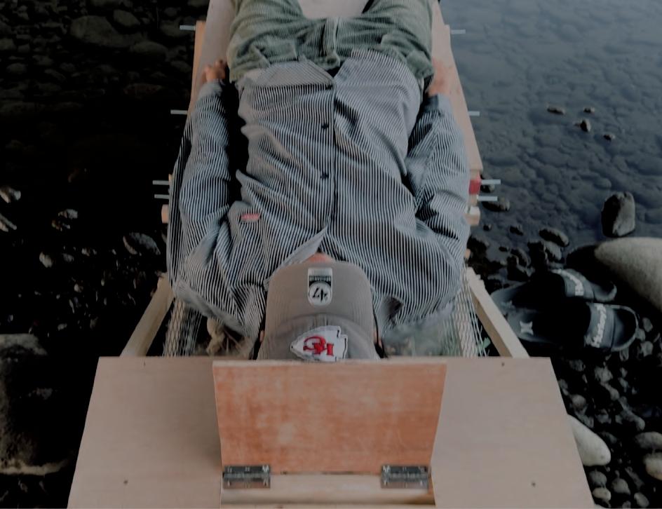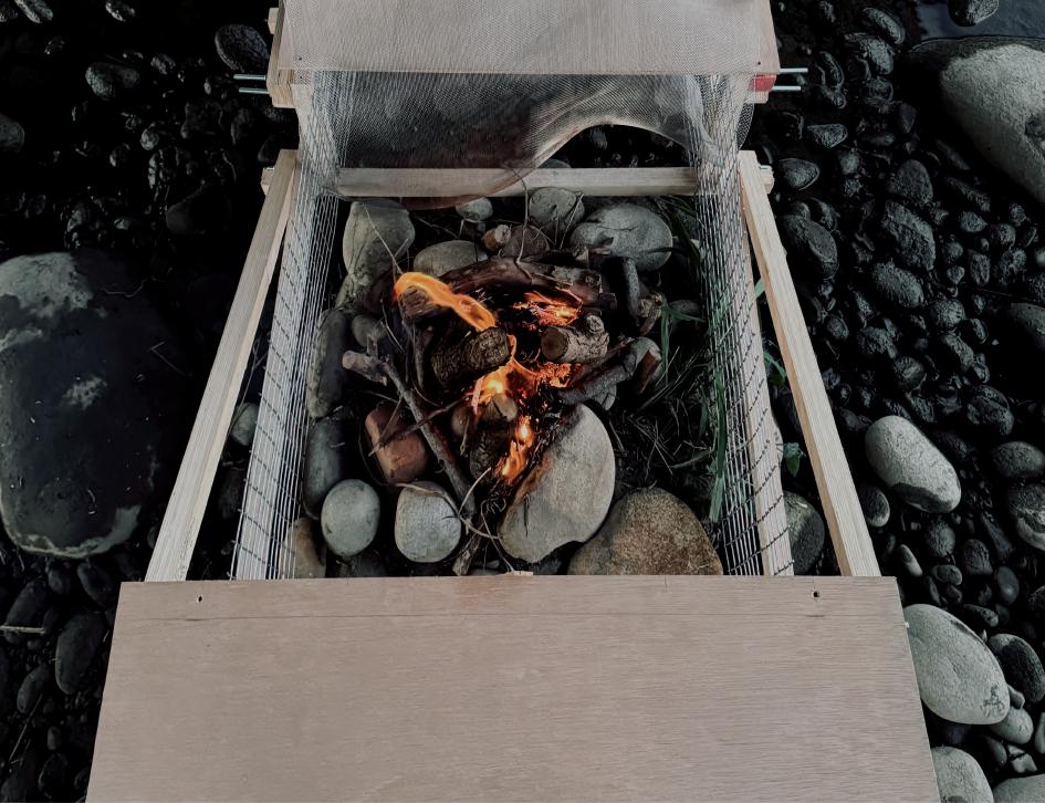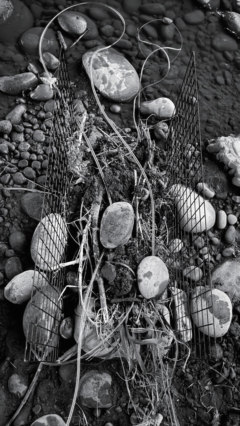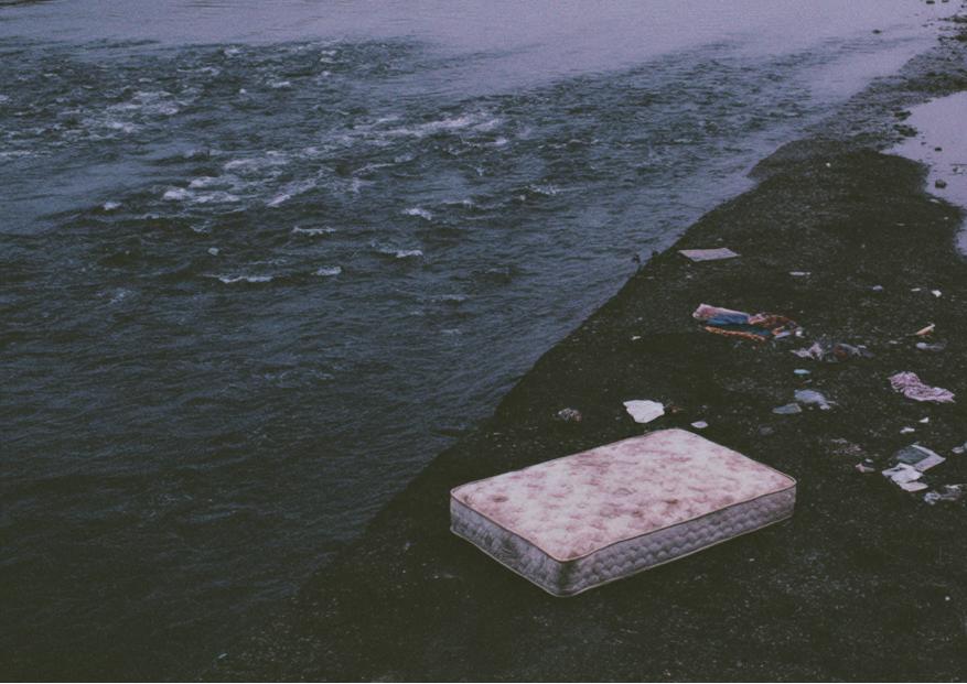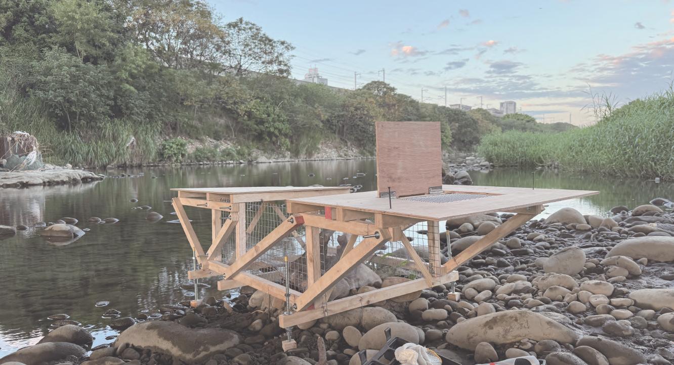 裝置「河床」的嘗試,探索身體與環境的互動,以及如何透過 儀式性行為(如進食)被動地介入環境,也同時作為一個閱讀 周邊環境的介質,特別是河面與河岸介面,揭示了城市的水作 為一種訊息載體。這將個人經驗與更廣闊的環境感知連結起來 ,並開始關注水作為載體的潛力。