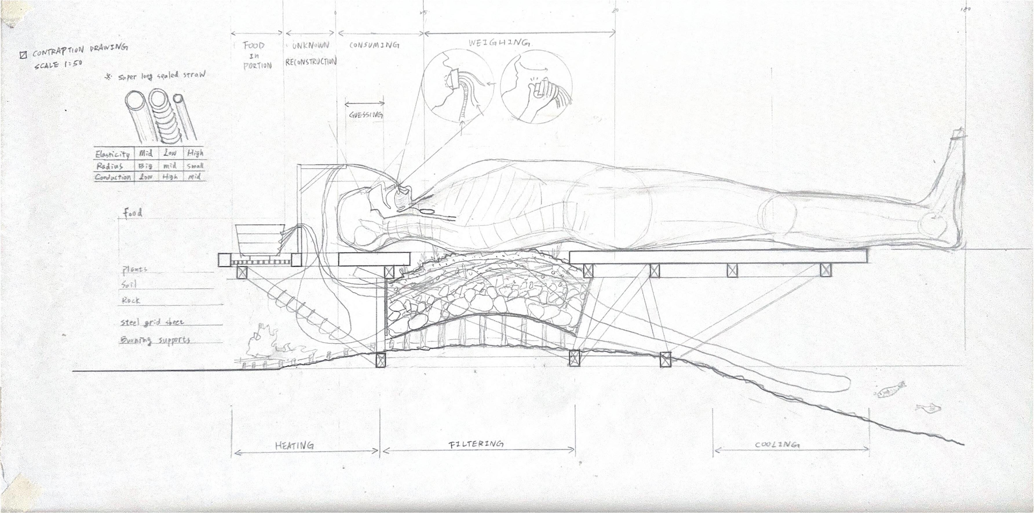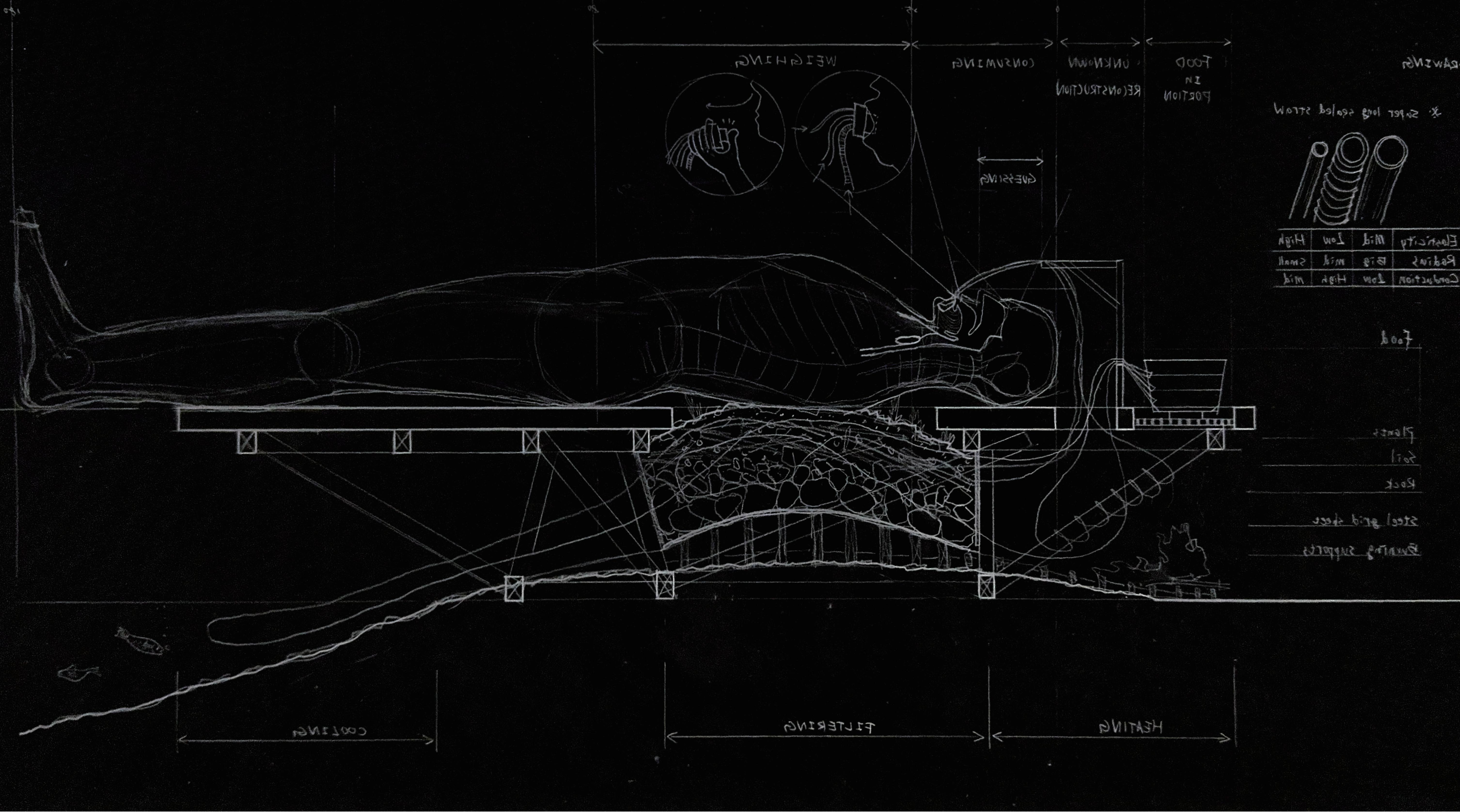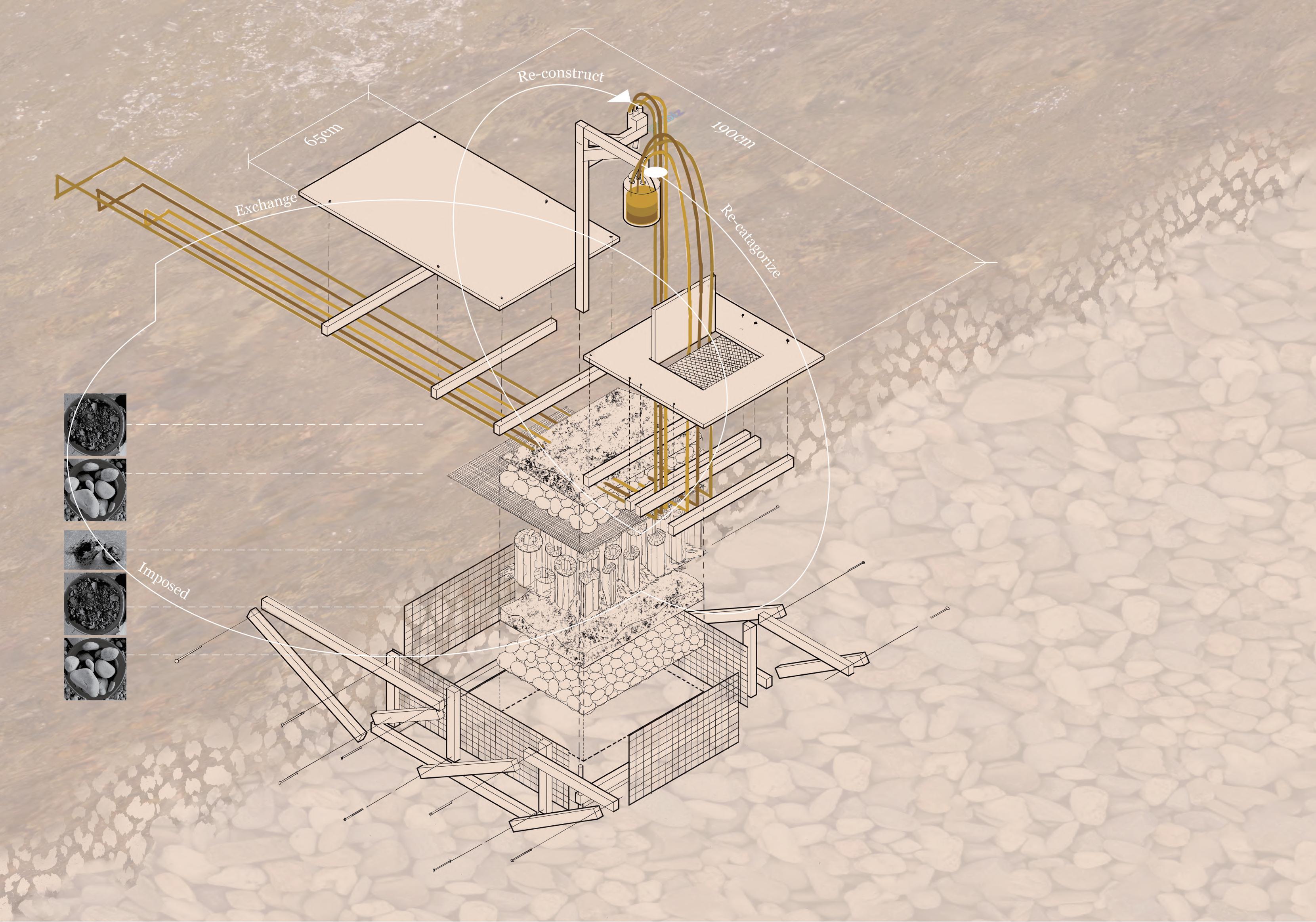 To linking to the environment The contraption RiverBED explored how the body interacts with its surroundings and how ritualistic actions like eating can subtly engage the environment.It serves as a medium for reading the interface between river surface and riverbank, uncovering how urban groundwater can act as a carrier of environmental messages. This bridged personal sensory awareness with broader environmental perception and introduced the idea of water as a information carrier.