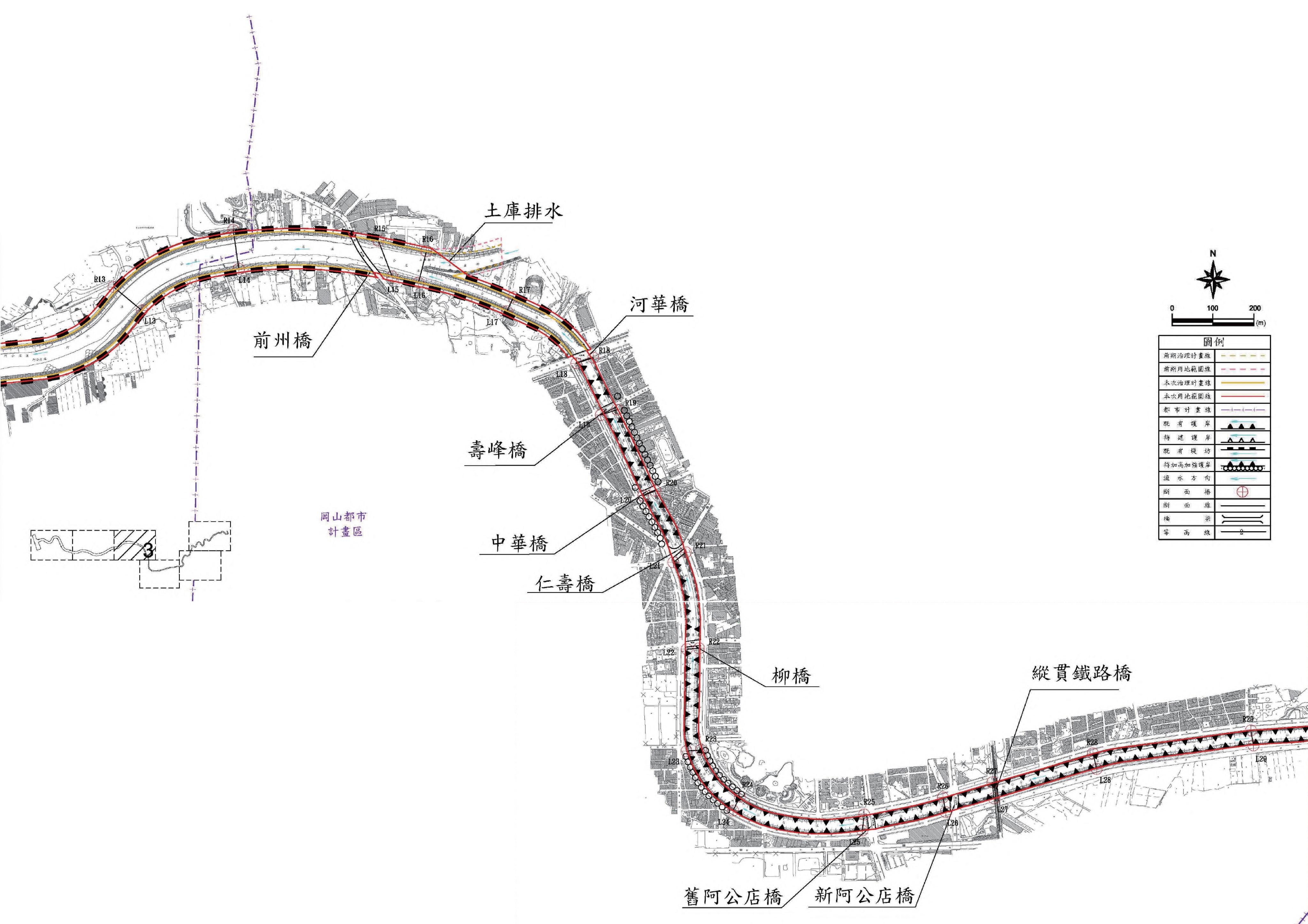 《阿公店溪治理計畫》作為典型的現代水利工程範例。該計 畫基於百年與五十年重現期洪峰流量等工程標準,主要目標 是透過築堤、護岸、河道截彎取直等工程手段來控制洪水, 保護沿岸居民生命財產安全及提高土地利用價值。它將洪水 視為需要「防範」、「消減」的「災害」或「水患」,城市 被視為需要「排水的容器」。