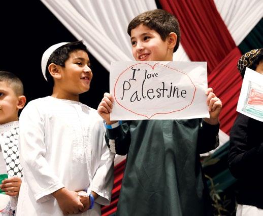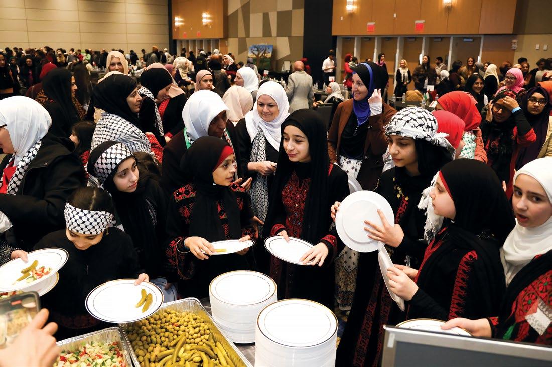 Attendees get in line for food during A Journey for the Soul: Celebrating a Living Palestine in the Gatton Student Center at the University of Kentucky in Lexington, Kentucky.