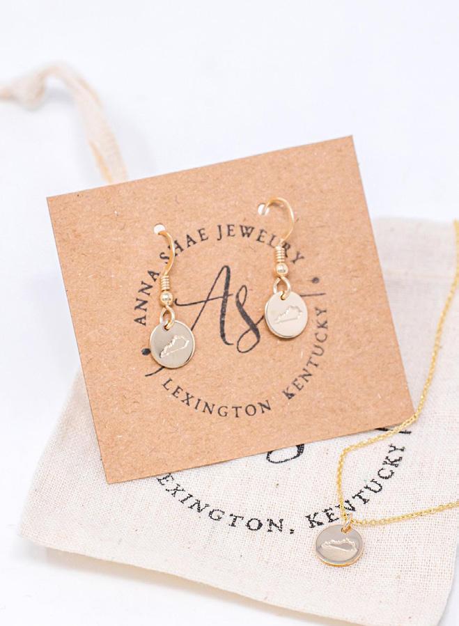 Specializing in minimalistic jewelry that can be worn every day, Lexington designer Anna Shae has a wonderful variety of simple designs. In addition to her gold-filled or sterling silver pieces—including rings, necklaces, bracelets and earrings—she has a necklace featuring the state of Kentucky that anyone with ties to the Bluegrass would treasure.