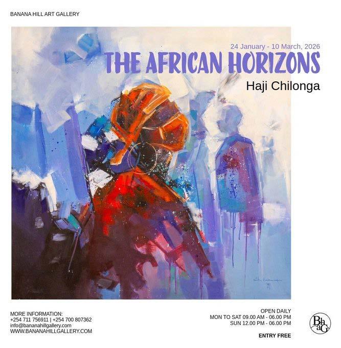 The African Horizons: Banana Hill Art Gallery, until 10th March. This exhibition invites visitors to explore contemporary African perspectives through an expressive and richly textured artistic vision. 0711 956911