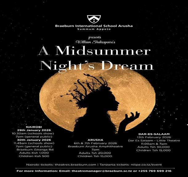 A Midsummer Night’s Dream: Braeburn Theatre Gitanga Road, 30th January. The play follows four lovers who wander into a forest, face mischief, misunderstandings, then reconcile for joyful celebrations.