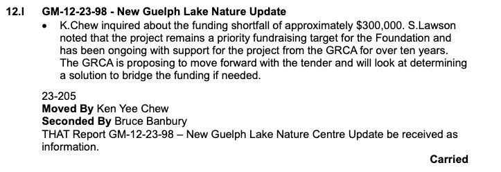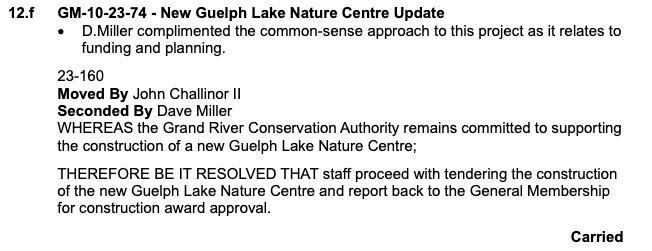 Great news! The Guelph Lake Nature Centre remains on schedule for completion, with the tender award receiving unanimous approval from the Board of Directors on March 22, 2024. Revisions to the design had to be made in order for the project to move along without further delays due to construction costs. This new building has been long-awaited, with the initial report scoping out a new facility dating back to January 28, 2011. Funding for this project is primarily facilitated through fundraising efforts by the Grand River Conservation Foundation. The future Nature Centre facility will be a tremendous asset to Guelph and the Conservation Authority. Joining the board towards the end of the project’s completion of the Guelph Lake Nature Centre has inspired me to continue seeking partnership opportunities that has potential to materialize in the future.