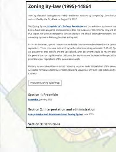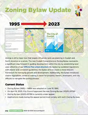 Zoning is still a major tool that largely infuences land use planning in Guelph and North America as a whole. The new Guelph Comprehensive Zoning Bylaw represents a signifcant step forward in guiding development within the city by establishing land uses refective of our Offcial Plan urban structure. By replacing outdated regulations with clearer and consistent guidelines, the bylaw aims to create a more relevant framework for managing growth and development. Additionally, the bylaw introduces clearer regulations, aimed at making it easier for property owners, developers, and city offcials to navigate the zoning process.