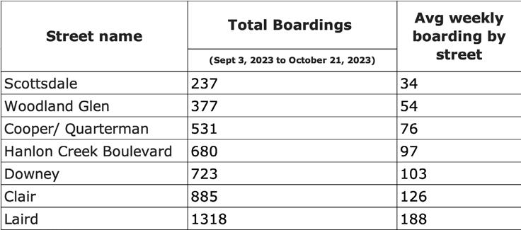 Route changes often provoke mixed reactions, as I experienced two months into my term when Route 19 was introduced onto Woodland Glen. This stop was part of a staff-led effort as per an approved route review initiated in 2019. To the residents of Woodland Glen, I understand the frustrations expressed by some of you who reached out to me. However, it is important for us to consider the broader network perspective and not isolate the decisions of transit with the ongoing needs for localized traffc calming. As your councillor, I am always advocating to staff for improvements around the bends on Woodland Glen. After refecting and seeing the ridership data, I am convinced Route 19 will be a crucial connector for Kortright Hills, north of Stone Road to Clair Road. Operationally, it takes time for transit frequency and ridership to mature and people only take transit when they can rely on it. That was my instinct as a full-time transit rider for most of my time living in Guelph. We are also seeing more teenagers take up public transit to school, the mall and volunteer activities. For these reasons, staff made the decision last year to allow this route time to fully mature before the completion of the South End Community Centre, Cooperators, and other commercial businesses over these next three years.