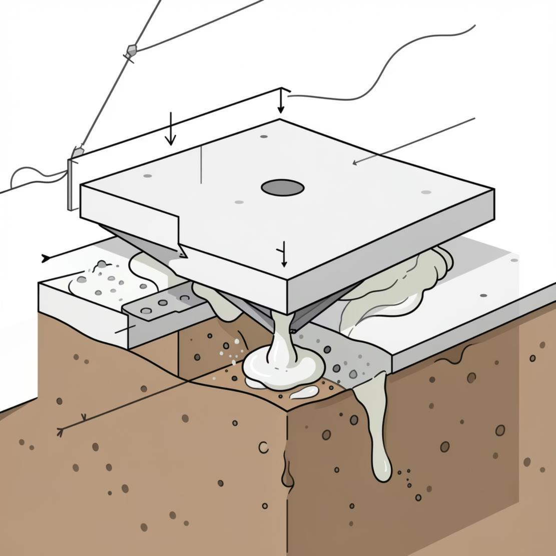 Mudjackingliftsasunkenconcrete slabbyinjectingacement-based slurrybeneaththesurface. Thematerialfillsvoids,stabilizesthesoil,and raisestheslabbacktoitsoriginalposition.
