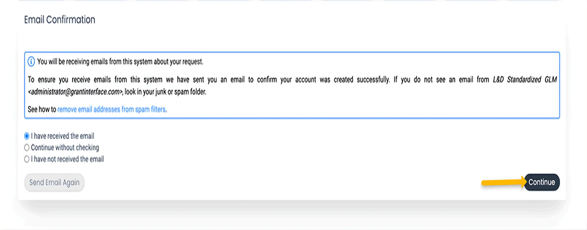 The next page asks you to verify that you received your confirmation email. This helps ensure that you will receive other communications from this organization about your application. Click Continue.