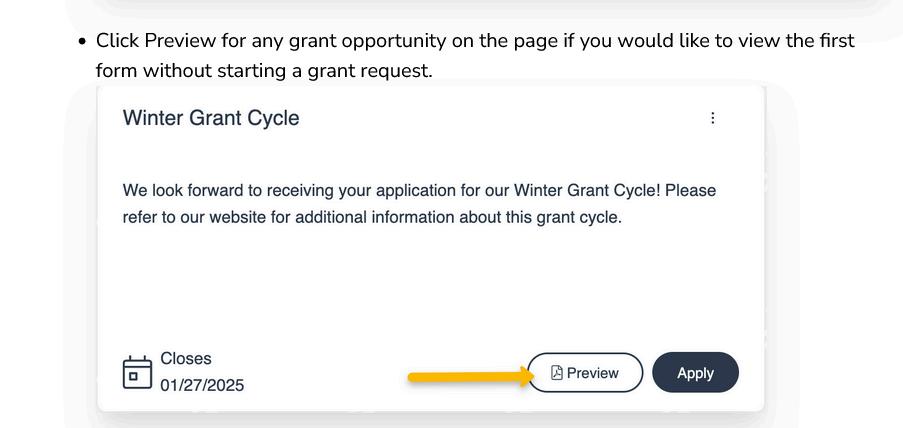 Click Preview for any grant opportunity on the page if you would like to view the first form without starting a grant request.