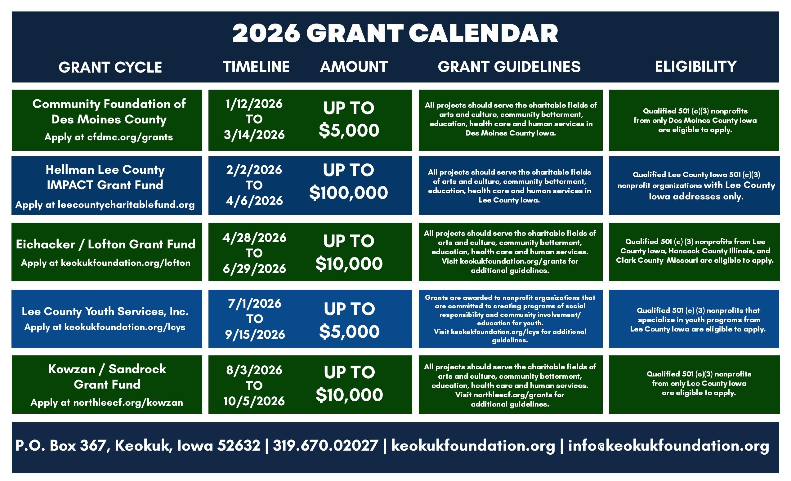 The Keokuk Area Community Foundation and North Lee Community Foundation invests in local nonprofit organizations that contribute to improving the quality of life in our communities. Our grants support innovation, sustainability and capacity building. Each grant opportunity has its own purpose, eligibility criteria, and award amounts.