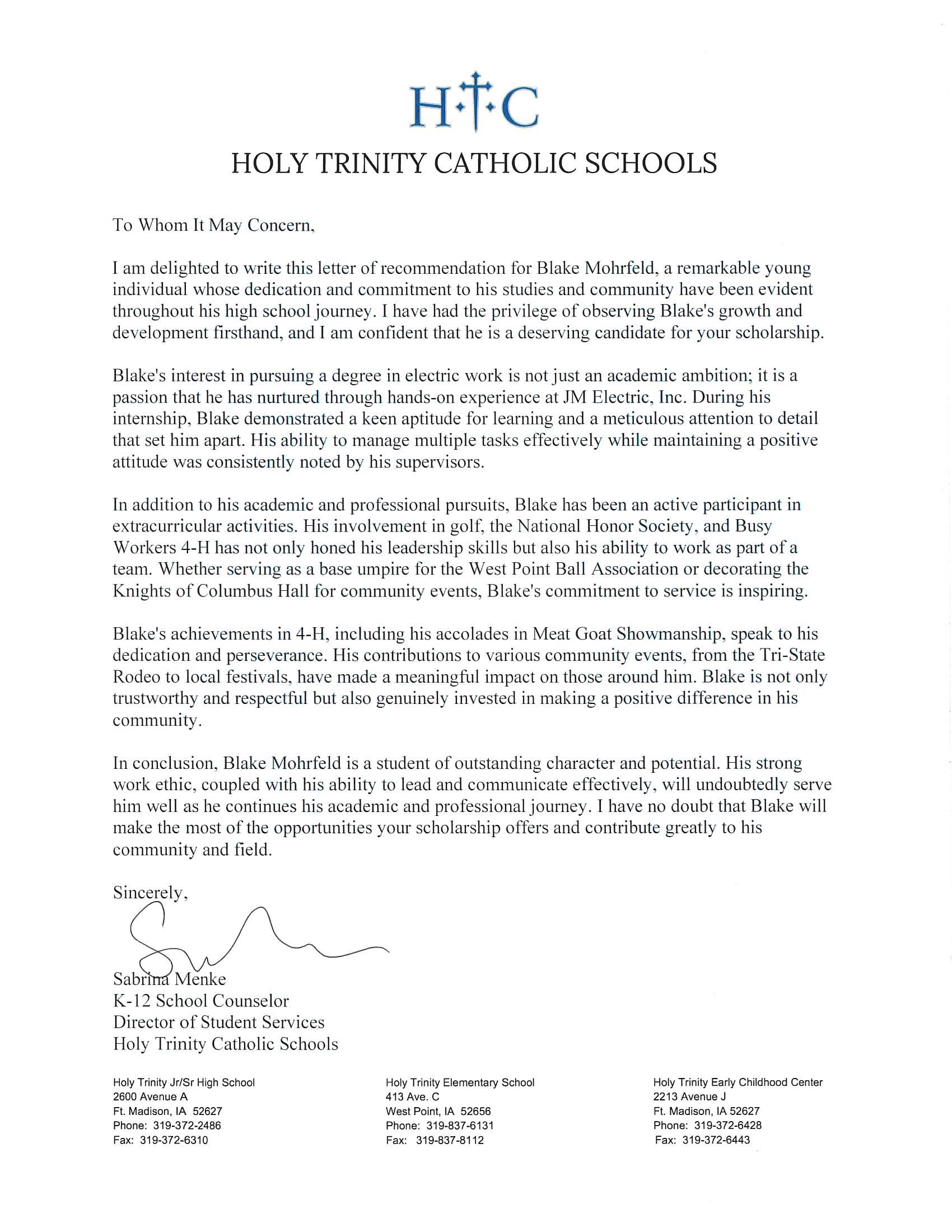 Academically, I have challenged myself throughout high school by taking weighted honors courses and dual -credit classes through Southeastern Community College. I am on track to graduate with 40 college credits while maintaining a GPA above 4.0 and earning honors such as the A -Honor Roll and the Presidential Scholarship. Outside academics, I have been involved in a wide variety of activities. In athletics, I have participated in cross country, basketball, track and field, volleyball, softball, swim team, and dance. Cross country has been particularly transformative; I began as a team manager in sixth grade and continued as a runner throughout high school, learning perseverance, teamwork, and goal -setting along the way. This year, I achieved a lifetime persona l record, reflecting years of consistent effort and dedication. I have also been a member of Swingspan, the varsity show choir, since freshman year, earning a front -row performer position a rare honor for underclassmen. I am actively involved in several sc hool clubs, including Vice President of the National Honor Society, a member of the student council, and the Varsity Club, which promotes school spirit and collaboration among athletes. These experiences have helped me develop leadership, organization, and teamwork while contributing meaningfully to the school community. Community service has been a central part of my life. I have volunteered at Vacation Bible School, Shuckfest, Princess Tea Party events, Lee County Conservation cleanups, Scouts BSA, the Ro tary Youth Leadership Awards (RYLA) conference, and as a camp counselor for kids’ show choir camp. One of my most meaningful experiences was volunteering in Nepal with the Rebuild Nepal Education Foundation, where I taught English and technology skills to students in grades 3 –10, supporting teachers and helping students access online learning. Inspired by this experience, I launched a project in Fort Madison to provide hygiene kits for 6th-grade girls in Lee County. I collected donations, coordinated a stud ent team to assemble and distribute the kits, and handed the project off to HOSA to ensure continuity and long -term impact. Since the age of fourteen, I have also worked at Hall’s Ice Cream, where I developed customer service skills, time management, and p rofessionalism while balancing school and extracurricular activities.
