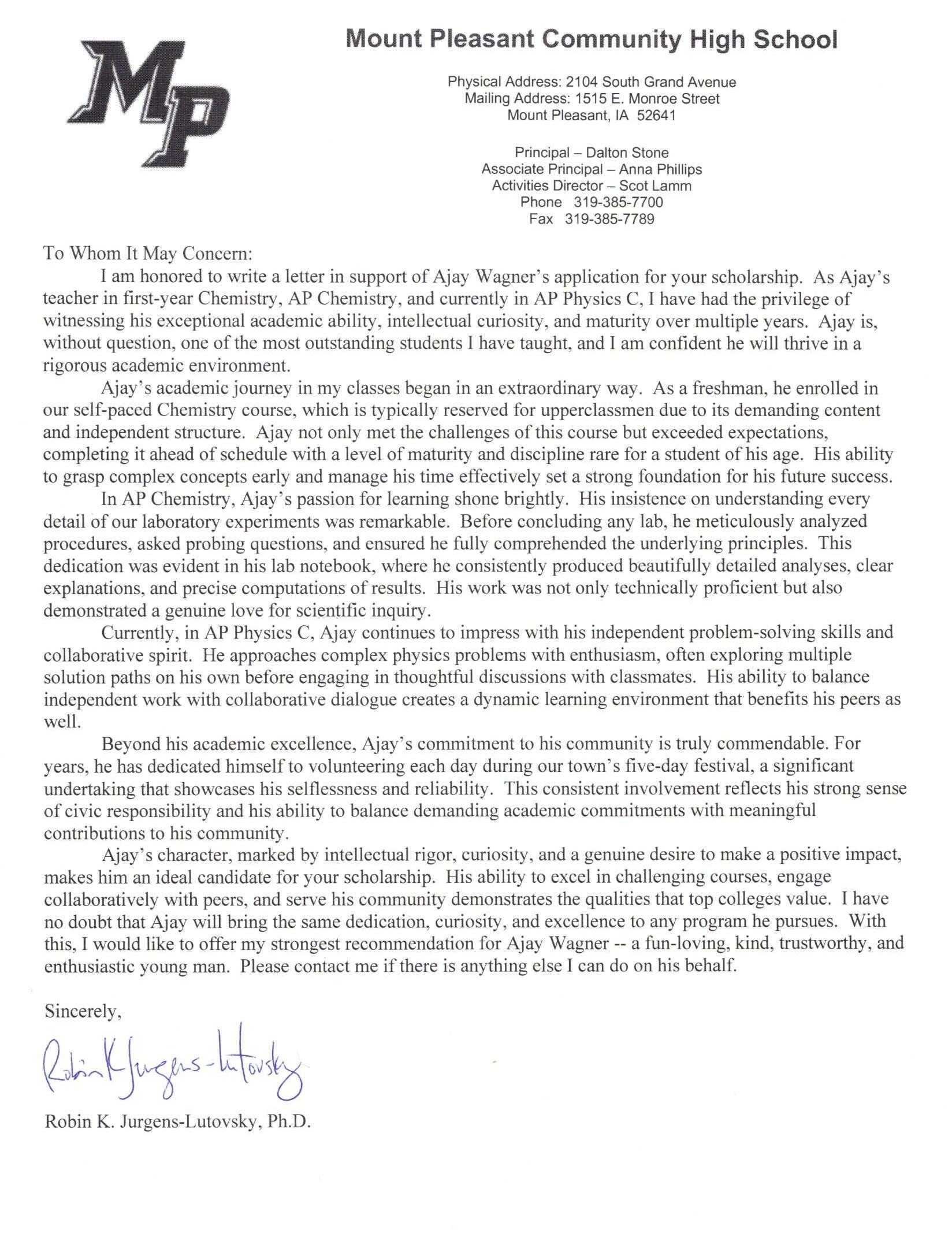 In addition, Amelia balanced college-level classes with extra curricular activities. Amelia is a very active member of our WHS Student Council, the WHS Environmental Club, and a four year member of our successful Titan volleyball team and a two year member of our Titan basketball team. Because of her academic success, Amelia was inducted into the WHS Academic Honor Society. While she was busy with these activities she maintained high honor roll status for four years. Amelia was also a dedicated community service worker. She was involved in our WHS Help-a-Thon campaign where students from WHS help local neighborhoods and families in need. Amelia has also maintained a part time job and was involved as a leader in her church youth group. It is for these reasons that I offer high recommendations for Amelia Harness.