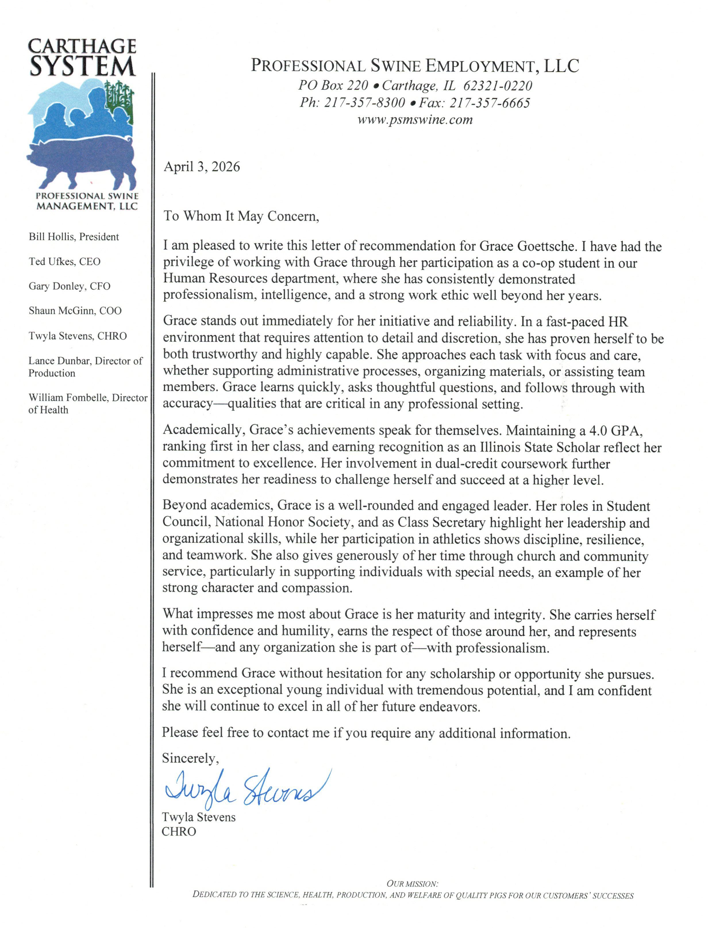 I started my first job this school year last August as a part of our school's Cooperative Education program. I work at Professional Swine Management in Carthage, IL where I work in the Human Resources Department as a Human Resources Associate. I run our co mpany Facebook and Instagram page, but also assist in day to day operations whether that may be data entry, employee record keeping, or even simply helping an employee with an issue. I work 5 hours a day, 5 days a week for a total of 25 hours worked each w eek. While Human Resources is not where I plan to continue with my future career, I have learned an incredible amount of things that I am positive that I can use after my time at Professional Swine Management ends following the end of the Cooperative Educa tion program this school year. I have learned the importance of paying attention to the little things, and making sure things are done right, because through my experience I have learned that doing things correctly and thoroughly really make all the differ ence. I have learned what it takes to work in a professional environment, developed teamwork and communication skills, and even learned life lessons in how much work occurs in the background of day to day things, and to always appreciate the things that go unnoticed.