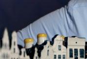 Wie bij ons op kantoor komt, ziet ze meteen staan in de spreekkamer: een hele rij KLM-huisjes. Miniatuur grachtenpanden uit Amsterdam, geïnspireerd op panden uit de Gouden Eeuw, uitgevoerd in Delfts blauw. Prachtig gemaakt en inmiddels geliefde verzamelobjecten.
