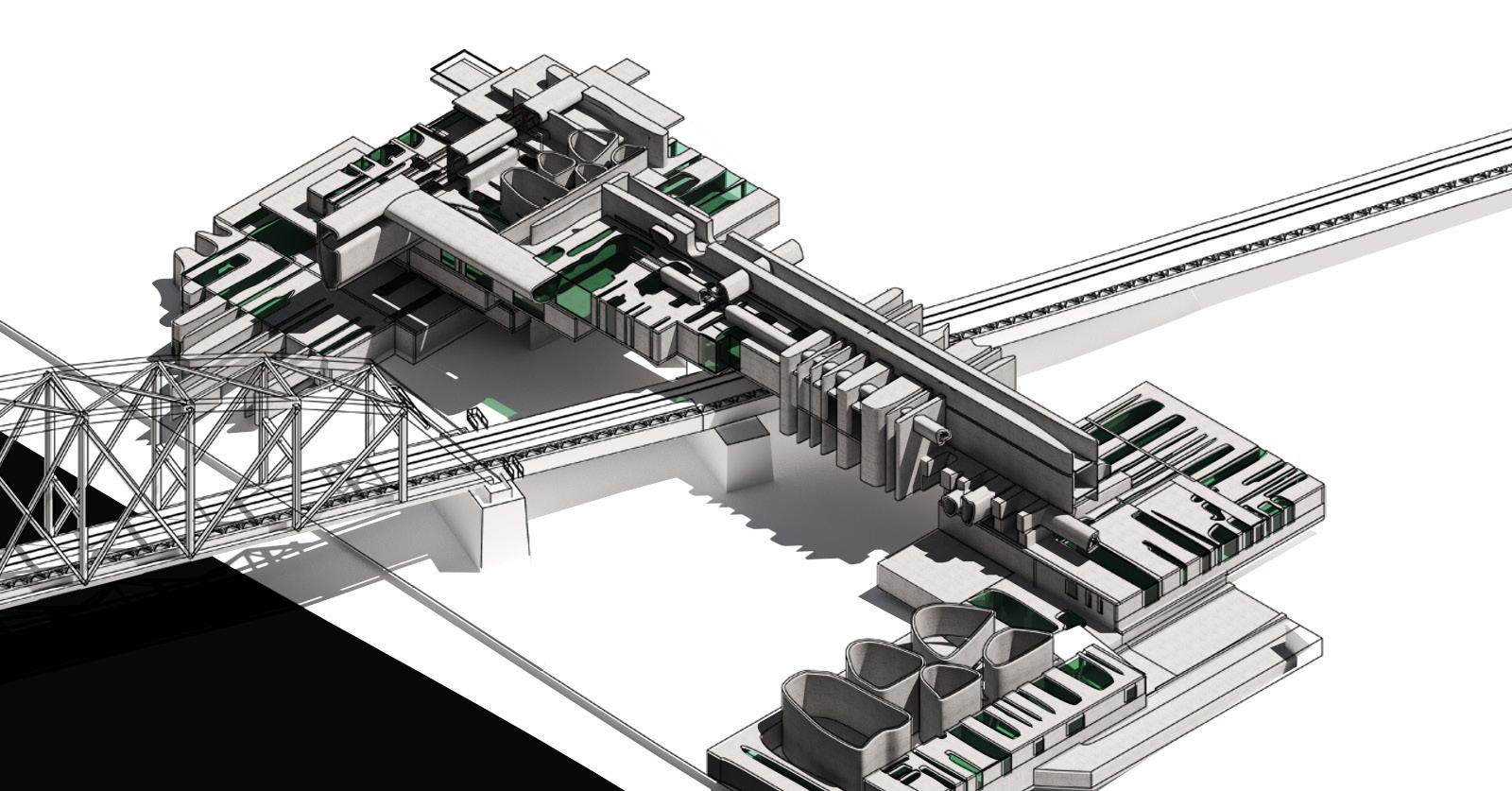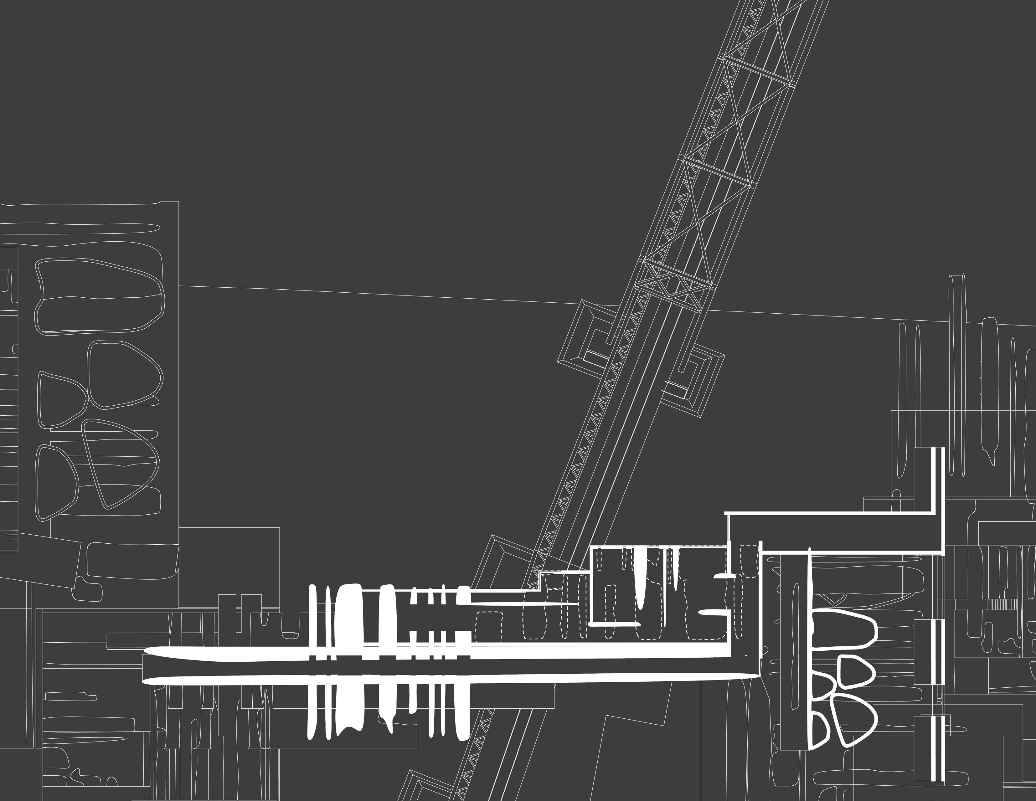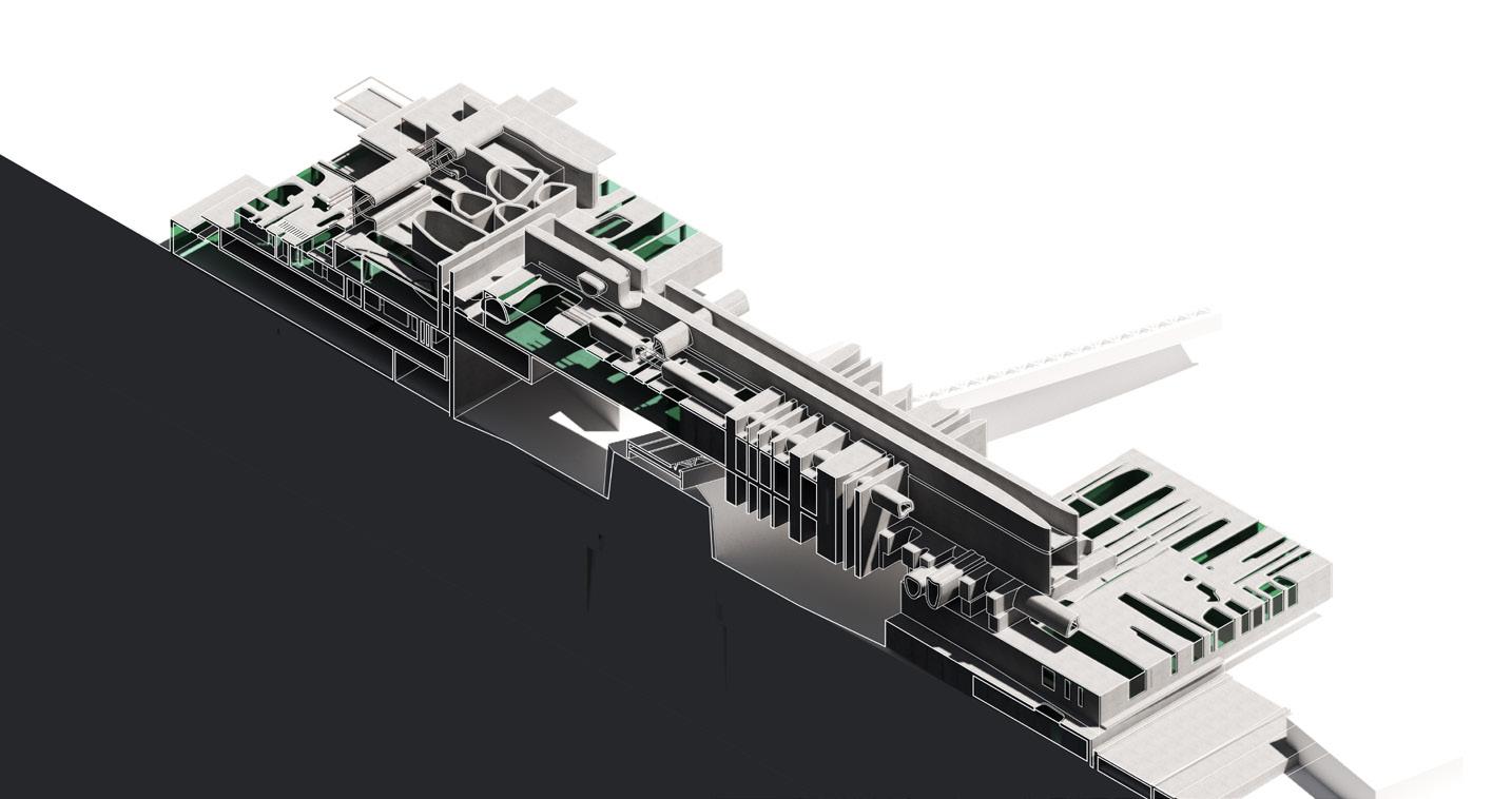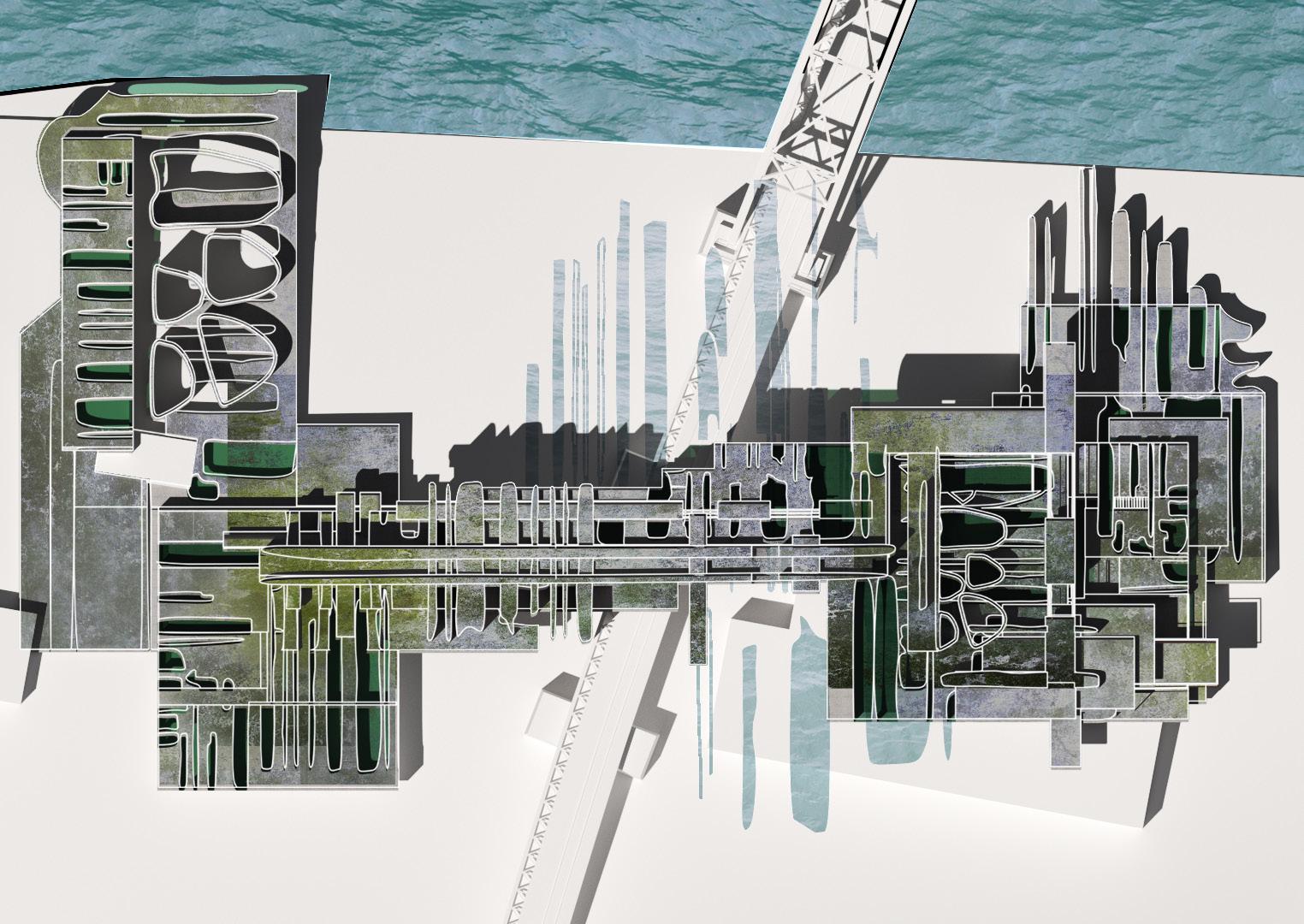 This project was meant to cultivate a building and situate it within the context and landscape of an old industrial site by the bank of the Allegheny River. Being so close to the banks of a large river that serves as a major artery of fresh water for the city of Pittsburgh, we decided to integrate the site’s hydrology into our building. First, we decided to create a stacked massing that would cross over the bridge situated at the site. We then decided to create a porous condition that would be applied as a skin across the massing. This skin would then intersect with the various vertical and horizontal wells that crisscross through my entire building. These wells are essential to my project, as they have multiple functions for the building. Some wells are used as circulatory space, while other wells are utilized to act as light wells that help light reach the further ends of the building. However, the main purpose of these wells is to store the water that is collected and filtrated through the entire building. As mentioned before, the building is closely tied to the hydrology of the landscape. The collection and filtration of this water are facilitated by the porous and curvilinear geometry of the entire building. In essence, the building could even begin to be considered as a machine that filtrates the plentiful rainwater and river freshwater that is available at the site. This water is then put into use within the building, acting as fresh water for the residents of the building and also cultivating a thriving ecosystem of plants within the building, as shown in my renders below.